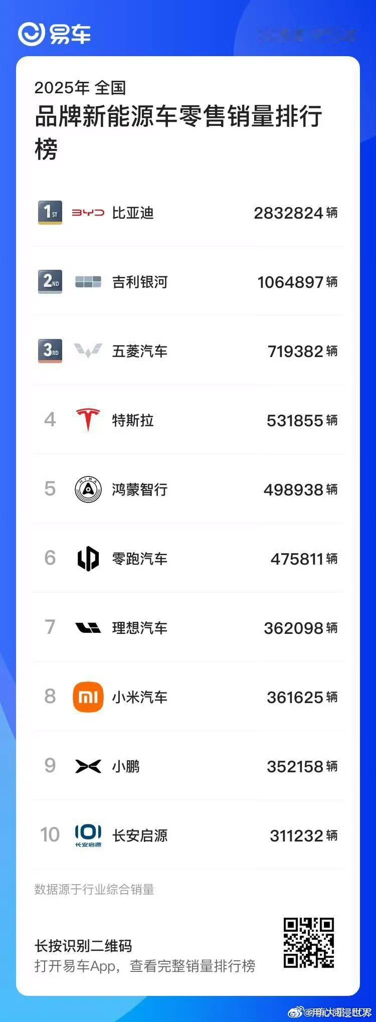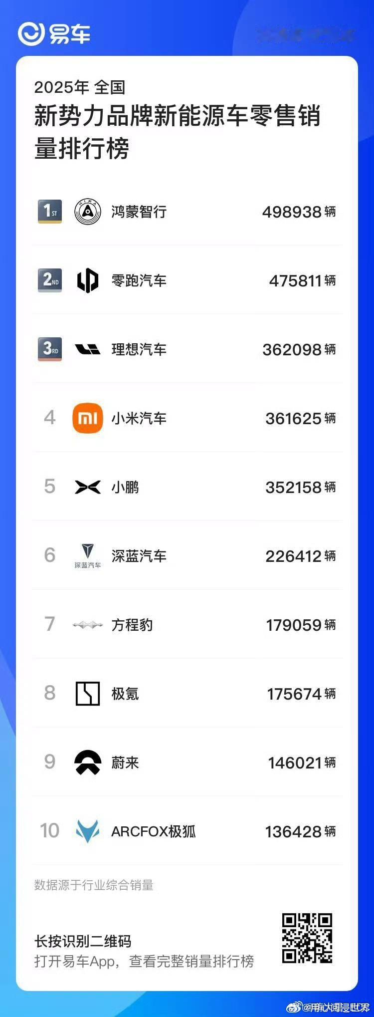 2025年1月至11月新能源销量榜整体榜里比亚迪以283万辆的成绩断层第一,是第二名吉利银河的两倍多,这统治力没谁了。特斯拉以53万辆排第四,而鸿蒙智行49.9万辆位列第五,看似稍逊,转头在新势力榜直接登顶,把零跑、理想、小米全甩在身后。新势力销量榜:鸿蒙智行成新势力一哥,零跑47.6万辆紧咬鸿蒙智行,理想和小米销量几乎打平,小鹏差了一点,蔚来却跌到第九,和头部差距越拉越大。 南宁