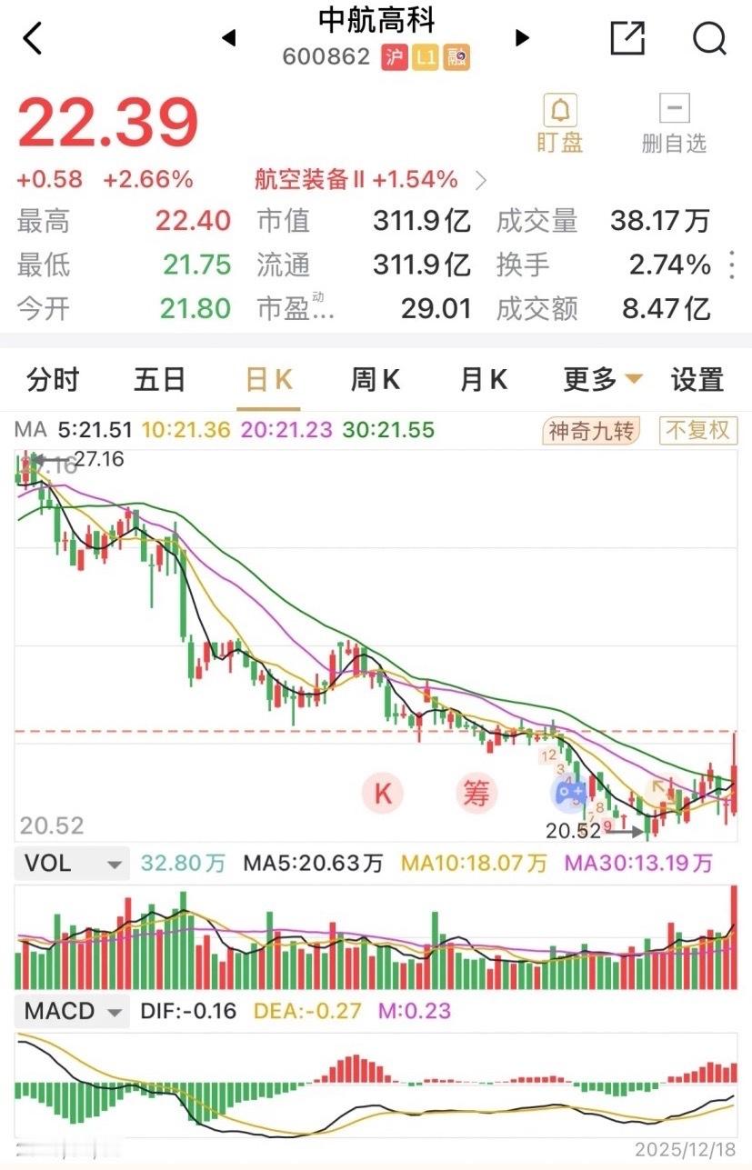 中航高科连续的两个中阳线放量上涨,触底反弹迹象明显。周四、周五的表现均比板块涨幅略强。不指望反转希望本轮反弹能够让我顺利解套成功。当时可是在26-27元高位看其像想向上突破才进入的,谁知道会向下深调呢!如今成本在24.0元之下,大概还有6个点的浮亏。连续四个月的回踩,如今月线止跌,涨约7%,估计能够先演绎成周线级别的上涨。
