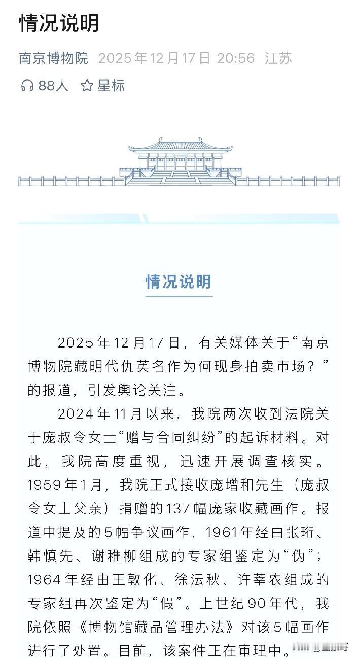 二十四年前,一位“顾客”以6800元价格,从江苏省文物总店买走了一幅明代“赝品”——《仿仇英山水卷》,如今,这幅“赝品”在拍卖市场上的价格为8000万元。 另外,南京博物院前任院长、江苏省文物总店创始人徐湖平在接受采访时表示,“这个事没有经我手,我不是书画鉴定家”、“我已经82岁了,年事已高、身体抱恙”、“我已经二十年不过问外界的事情了”。 当年可是你徐院长亲自签下的字哦,现在却说没经手,你当历史档案是空气吗?