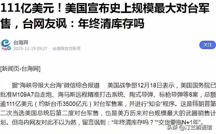 解放军报详解美对台111亿美元军售案 美国又搞事了!12月18日,美方批准对台湾总额逾111亿美元的军售,这可是史上单笔金额最大的美国对台军售案。《解放军报》直接开炮,强烈谴责这种粗暴干涉中国内政的行径。 这次军售涉及的武器可不简单,“海马斯”有进攻性,M109A7自行榴弹炮射程达30公里,还有自杀式攻击无人机等。美国妄图把台湾武装成“刺猬岛”“豪猪岛”,消耗中国,还借机敲台湾竹杠。民进党当局还“甘之如饴”,真是糊涂至极。大陆在军力上有压倒性优势,美国这小算盘注定打不响,“以武谋独”就是痴心妄想,倒行逆施必食恶果!
