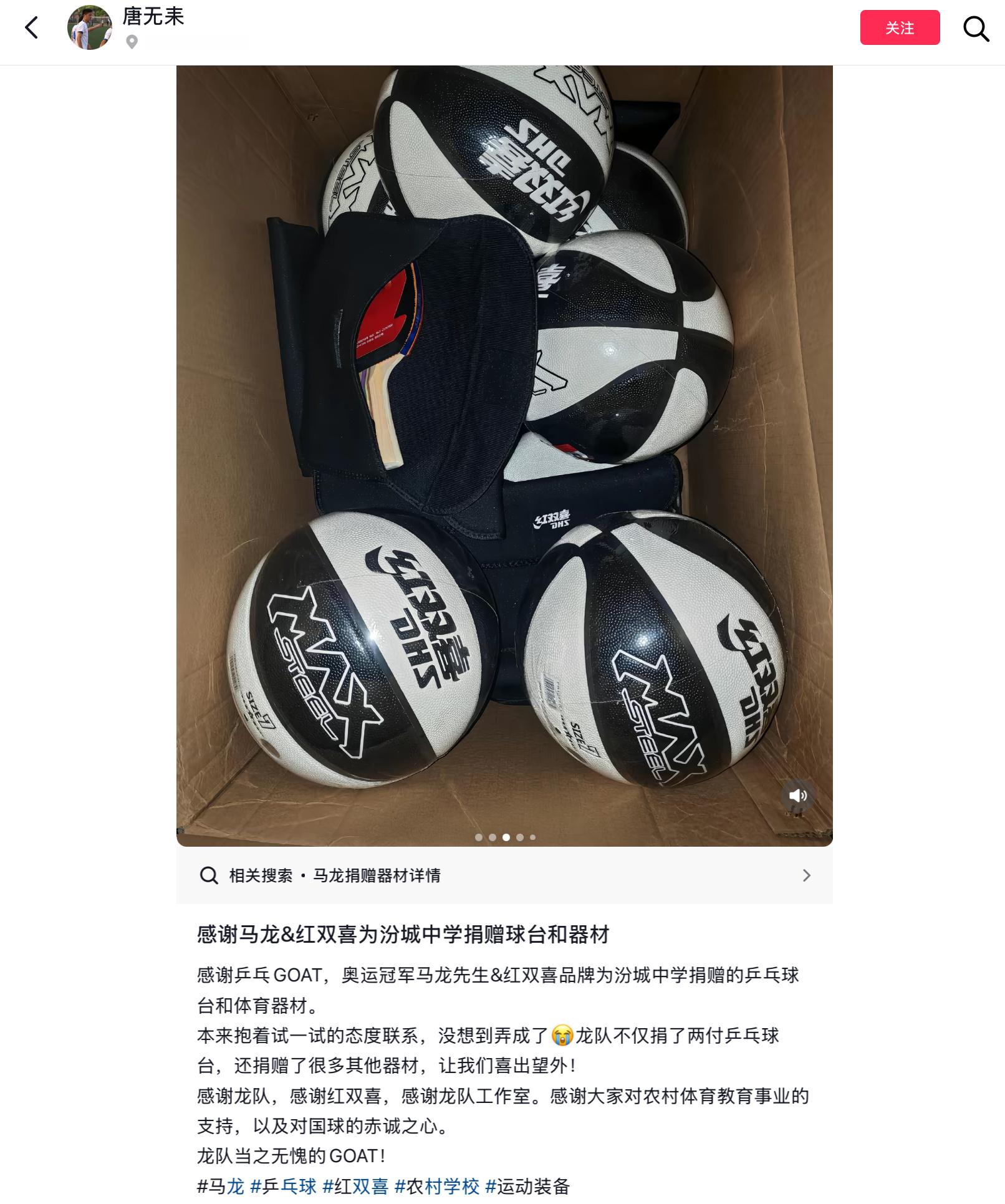 马龙我和我的球台 抱着试一试的心态,不仅收到了球台,还有马龙捐赠的很多别的器材