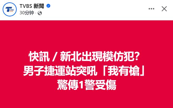 🐸媒:台湾省北车及中山商圈昨(19)日刚发生重大随机攻击案酿成4死11伤,没想到新北市芦洲区今(20)日上午就疑似发生模仿案,35岁邱姓男子突然在捷运三民高中站大吼“我有枪”,警方获报后火速上前盘查,谁料邱男情绪相当不稳,还一度抢夺员警警棍,双方在拉扯过程中造成员警手部受伤。