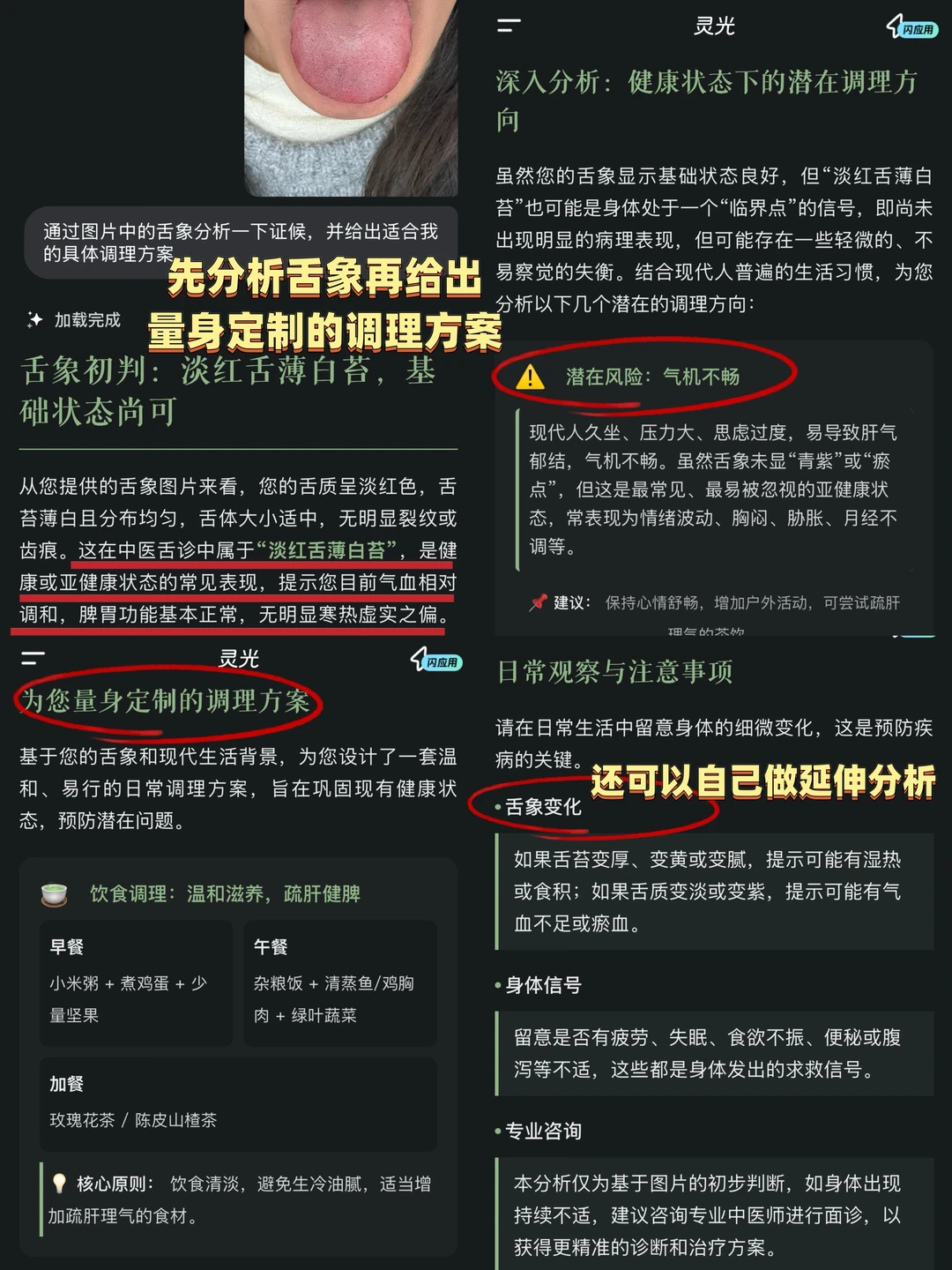 这个时候我就会拍张照,让灵光App直接帮我分析,并且给出详细的饮食、茶饮等等调理方案。