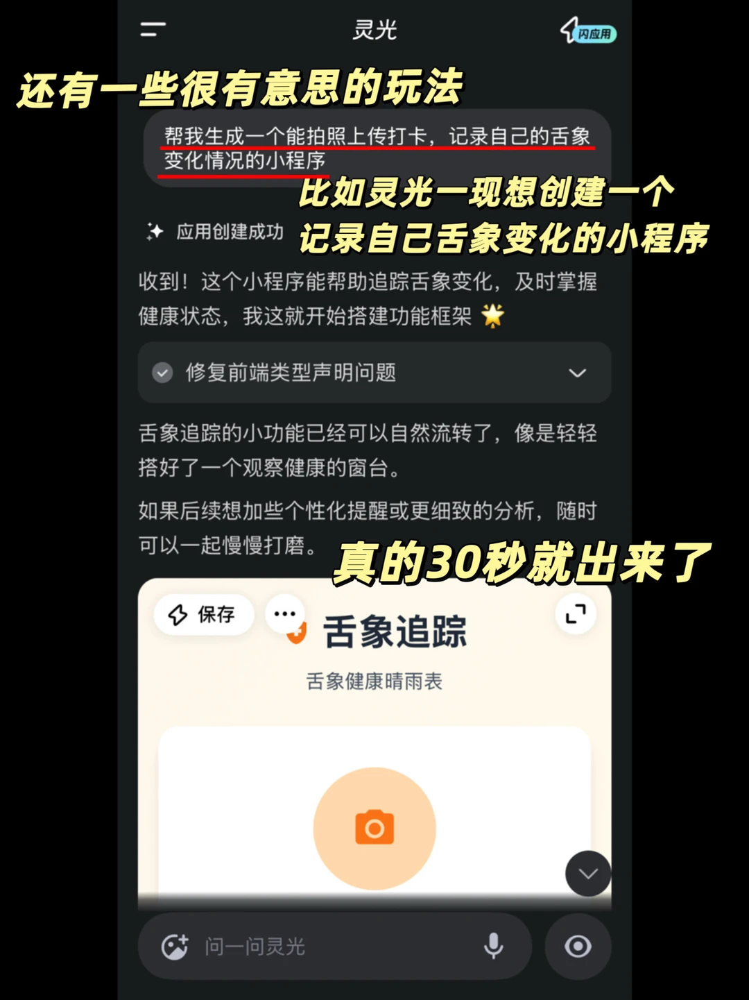 另外这个App还有一个神仙功能,就是把想法变成应用,比如我刚刚灵光一现想创造一个能记录自己舌象变化的小程序,还可以生成舌象周期变化分析,简单一句话,30秒不到,小程序就出炉了……