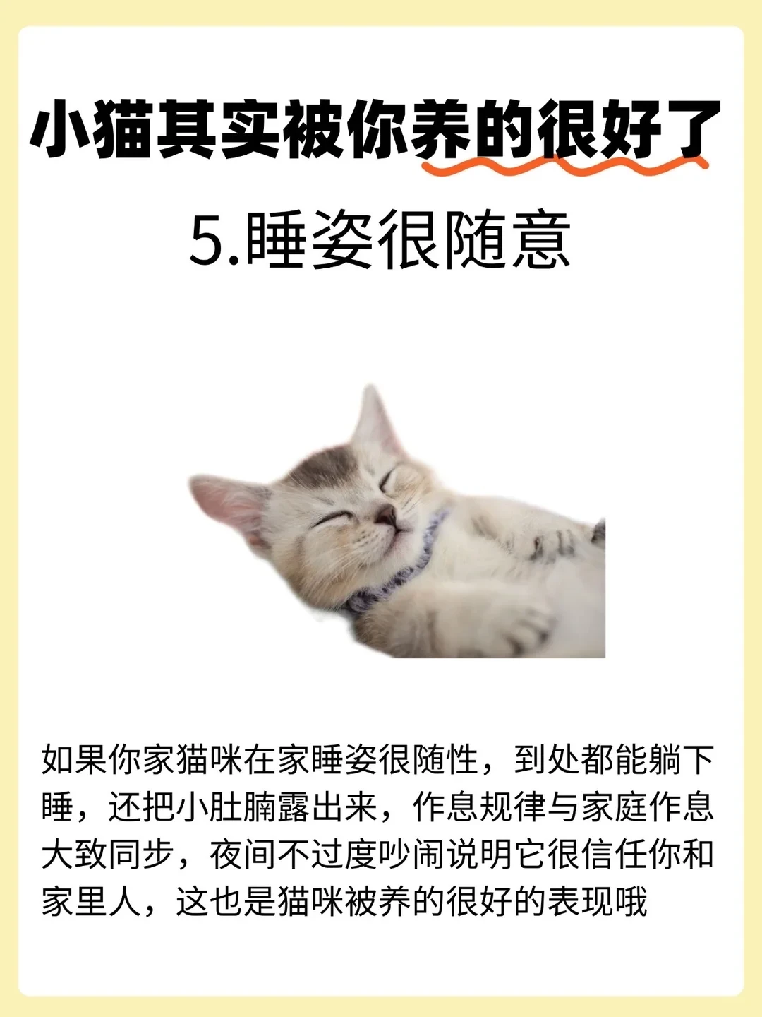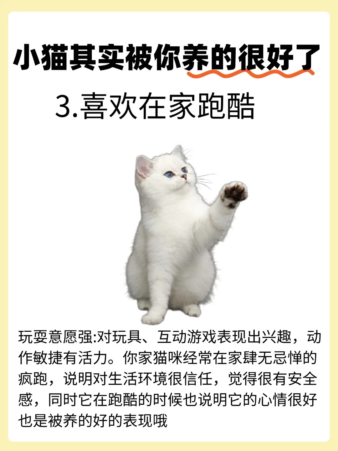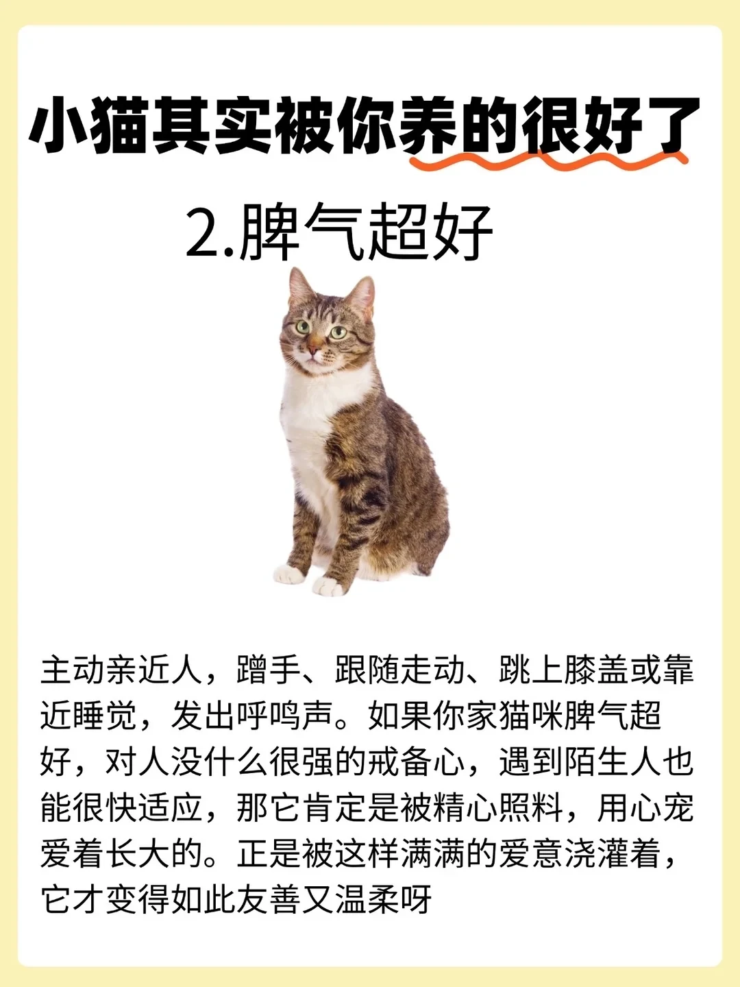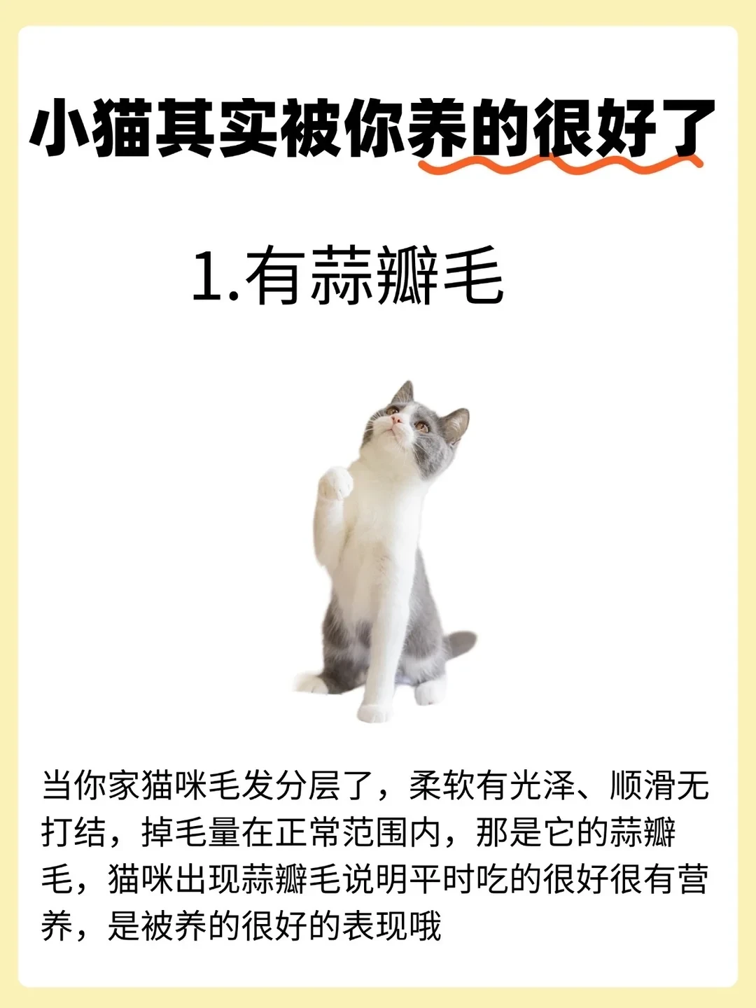 你家猫这些表现,说明被你养得超幸福!别再自我怀疑啦~ ✅养得好的信号: 有蒜瓣毛:毛发分层、软亮顺滑,是营养充足的证明; 脾气超好:主动蹭人、躺你身边呼噜,是被爱意浇出来的温柔; 在家跑酷:放肆疯跑 = 对环境超信任,安全感拉满; 外表干净:眼睛亮、鼻子润、毛发顺,健康都写在脸上; 睡姿随意:露肚肚到处躺,是把你当家人的松弛感~ 能养出这样的小猫,你已经是超合格的铲屎官啦!