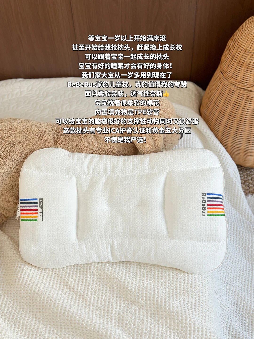 这个阶段的宝宝正是脊椎发育“黄金期”,睡觉要“护脊”为主。BeBeBus家的儿童枕有ICA护脊认证,枕头很好的贴合宝宝脊柱,给我的宝宝恰到好处的支撑,每一个夜晚都睡得香甜❤️它有黄金五大分区设计,四周高中间低,而且枕面很宽,好动的宝宝睡一整夜也乖乖在枕头上!TPE中空软管枕芯有5000多个透气孔💨,爱出汗的宝宝也不怕!