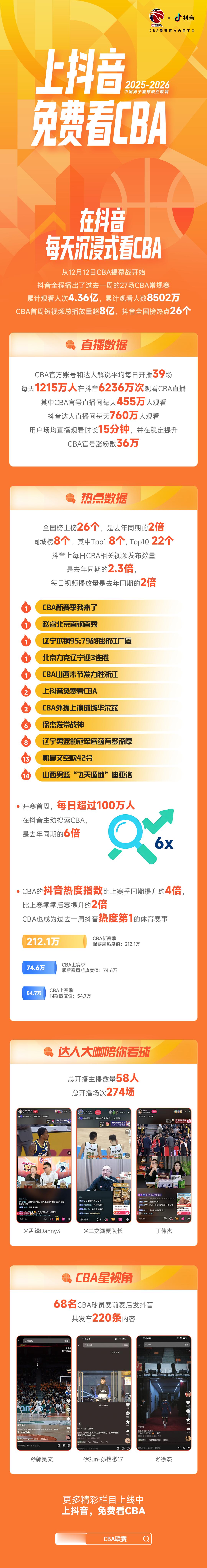 CBA官方发布抖音直播首周战报,每天有1215万人在抖音观看6236万次CBA直播,有看过探长直播的吗 cba