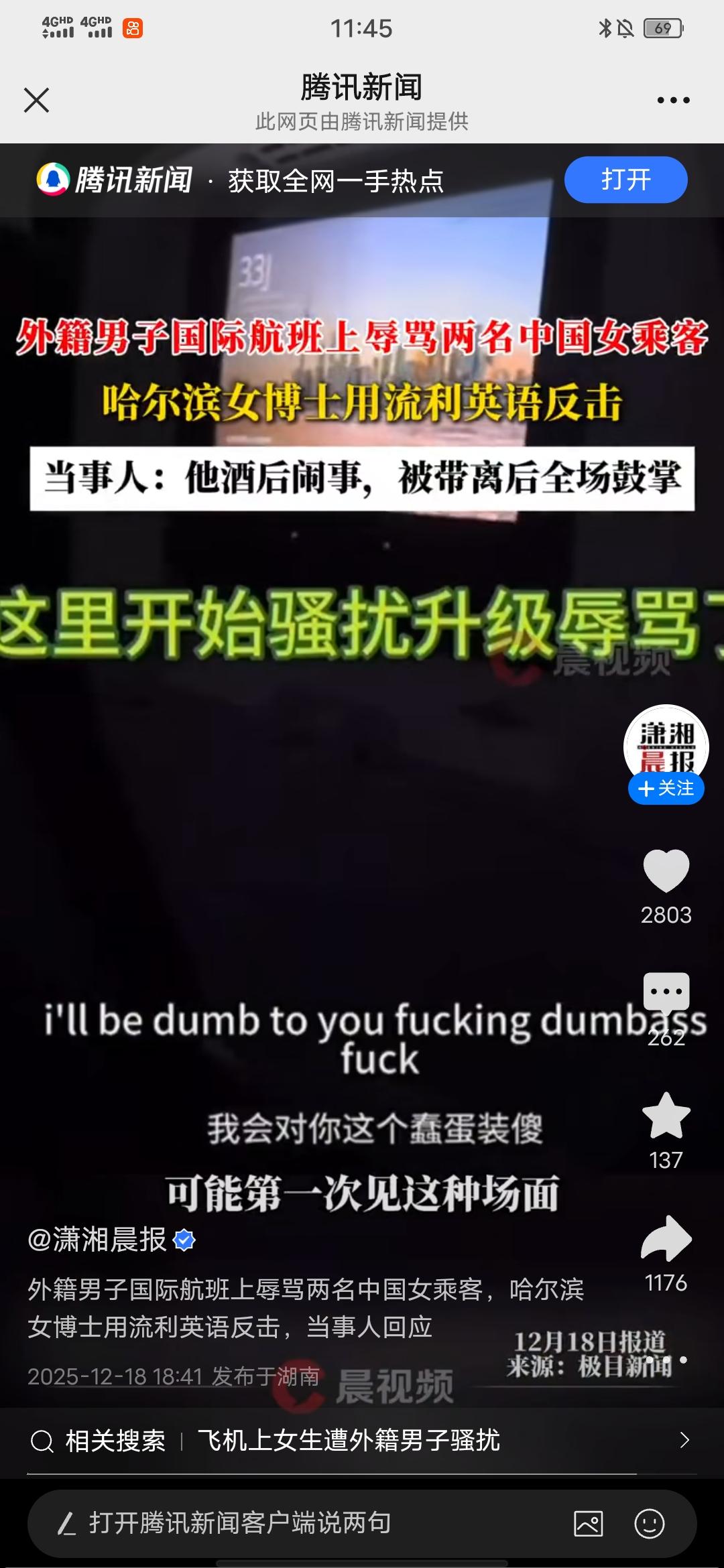 外籍男子国际航班上辱骂两名中国女乘客,哈尔滨女博士用流利英语反击。 刚在潇湘晨报平台看到的报道,近日,在加拿大某航空航班上,一个哈尔滨的女博士孙女士,听到在她前排的一个外籍男子,一直在辱骂旁边的两名中国女子,不怕事的她站出来用流利的英语反击,当时飞机正在滑行准备起飞,孙女士按了呼唤铃,唤来空乘人员,开始空乘试图安抚这骂人的男子,结果这外籍男子又开始骂空乘人员,后来飞机就掉头滑回廊桥,将这没有素质的人带下了飞机,找到他的行李后,飞机再行起飞,当他起身那一刻,整个飞机上的人都在给孙女士鼓掌。 孙女士是在多伦多附近城市读博士,他说这样的事情她见多了。他们就是欺软怕硬的货,看到同胞被欺负,她自然是要站出来反击的,孙女士的行为获得了全网同胞的赞许,称她为“女侠”。 是啊,为孙女士点赞,同胞们不管身在何方,大家都应该同声同气,团结相护。 同时,看到一个网友说,不要说读书无用,也不要抗拒多学其它语言,因为当你什么都听不懂,别人在侮辱你骂人欺负你的时候,你都不知道发生了什么。深以为然,曾经,我身边就遇到一个在超市上着班,拿着起早贪黑微薄工资的人信誓旦旦地给我说,读那么多书有什么用,我当是没有正面回击,因为是我老公兄弟的老婆,不好驳她面子,更重要的是我不愿与蠢货论短长。 重点是素质不分国界,是人都该有素质,不过欺负同胞的,就是不行。咱们中国人就是应该团结一致对外,才不会被外欺负,给孙女士点赞,有血性!棒棒哒!