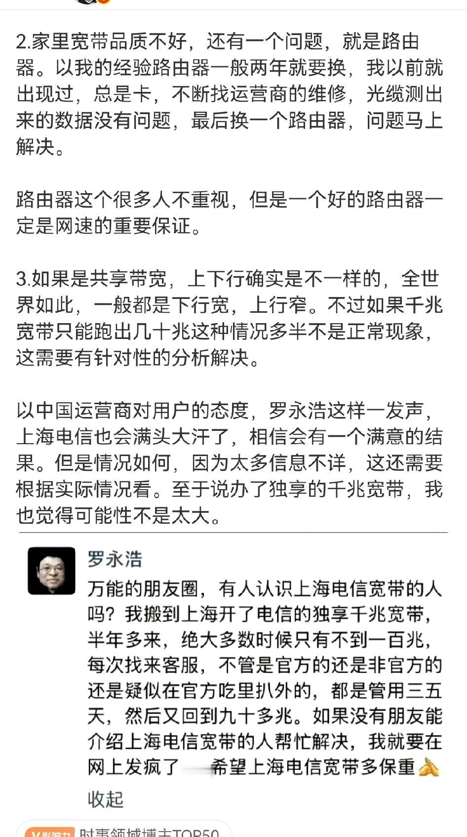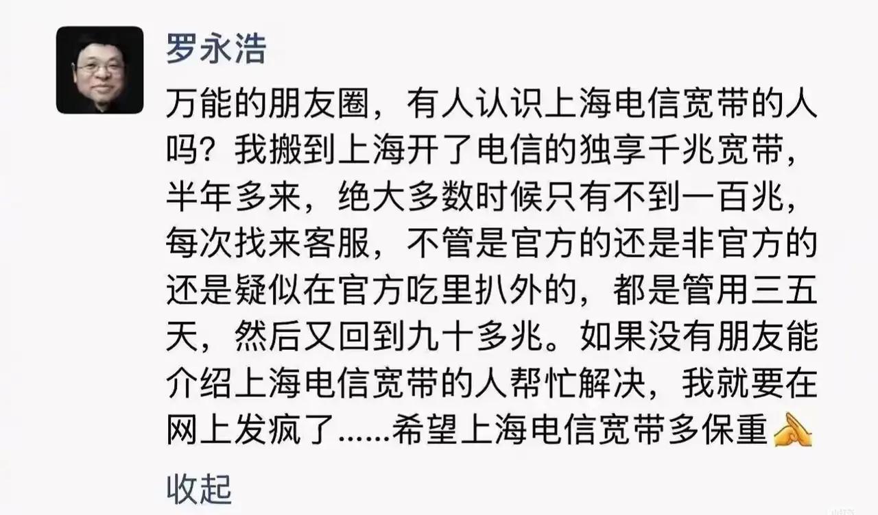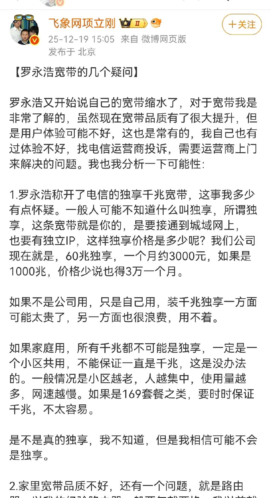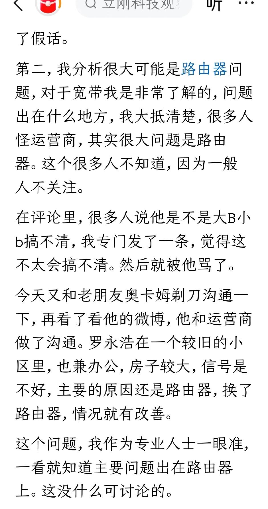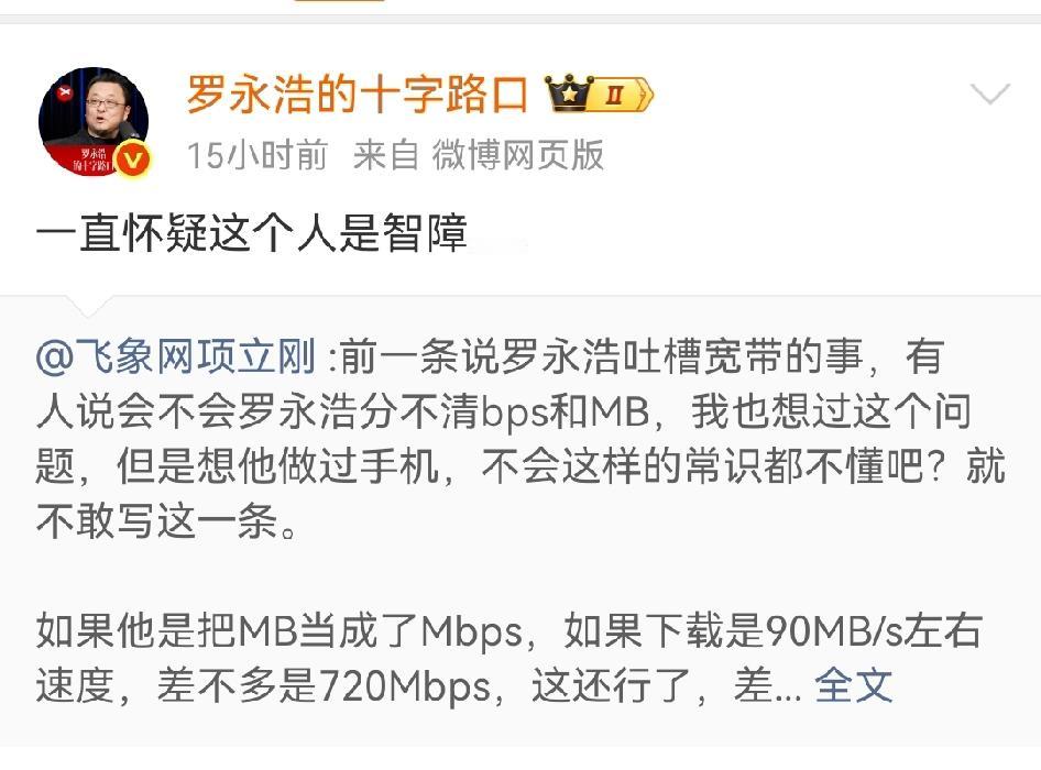 罗永浩怒怼项立刚是智障。 事情的起源是罗永浩吐槽上海电信1000兆宽带,实际常常只有100兆左右。 项立刚作为专业人士,分析了可能出现的原因。 随后罗永浩回复:一直怀疑这个人是智障。 项立刚随后发文,认为罗永浩除了做直播,做什么都不会成功,并调查到罗永浩住在一个旧小区,房子较大,信号不好,主要原因是路由器。 看来两人是杠上了,一个认为对方是智障,一个认为对方除了做直播流量,其他啥都做不好。