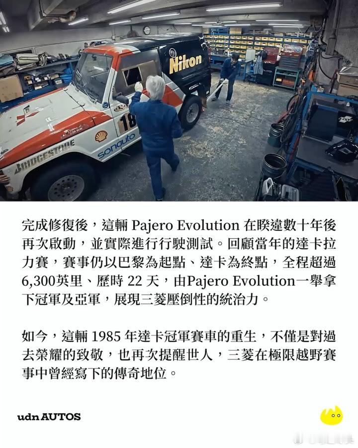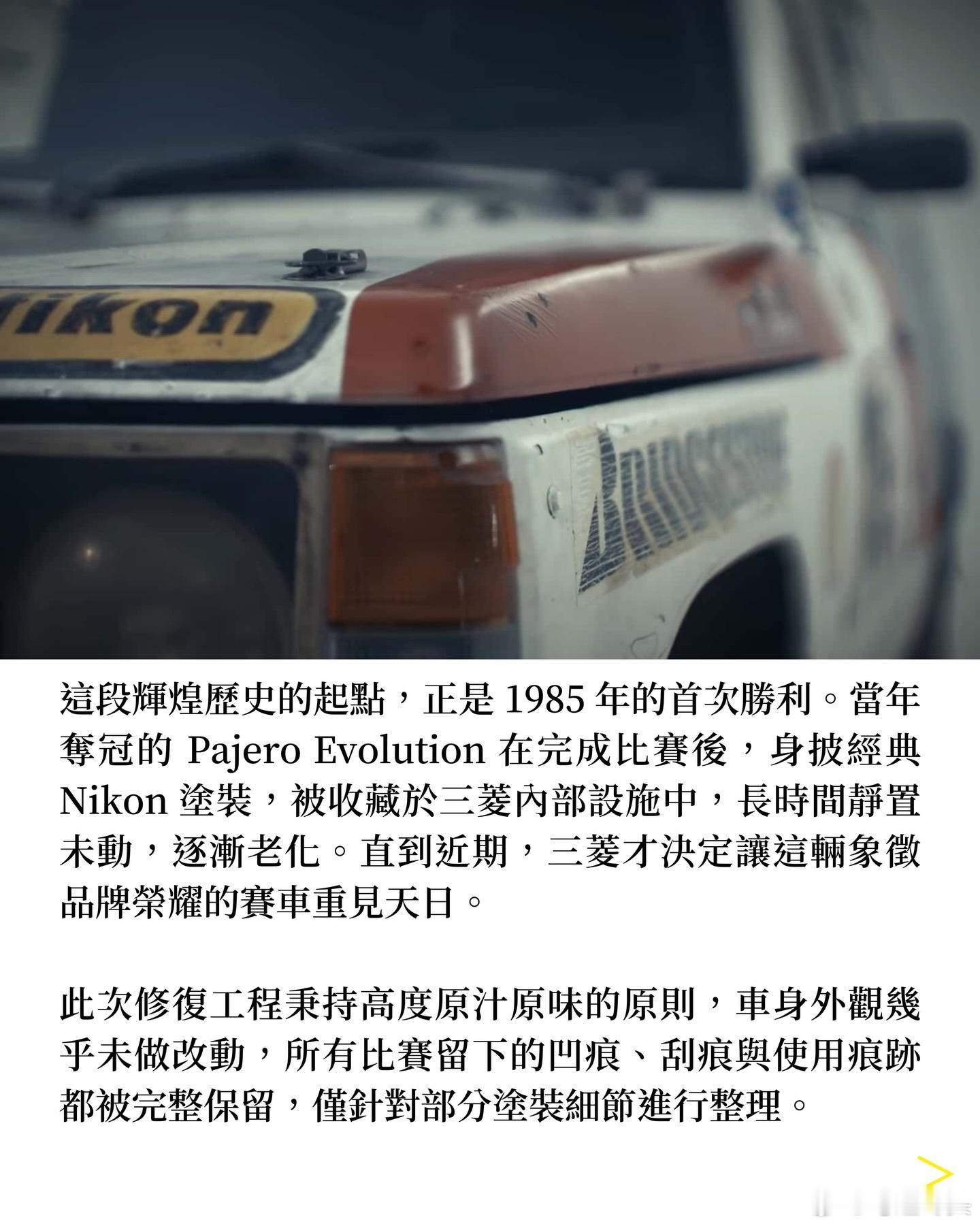 帕杰罗 三菱近日让一段达喀尔传奇重获新生。三菱品牌首輛拿下达喀尔拉力賽总冠軍的 Mitsubishi Pajero Evolution,在尘封近 40 年后完成修復,再次踏上旅程。這辆身披经典Nikon 涂装的拉力赛车,1985 年写下三菱達拉力赛王朝的起点,后续累积了12 次冠軍。修复的过程保留所有赛事痕迹,仅针对机械结构进行了翻新,由资深和年轻工程师共同完成,象征着技术与精神的世代传承。如今重启引擎的那一刻,也让人再次感受达喀尔越野最纯粹的热血。ralliartmitsubishipajeroevolutionevolutiondakar