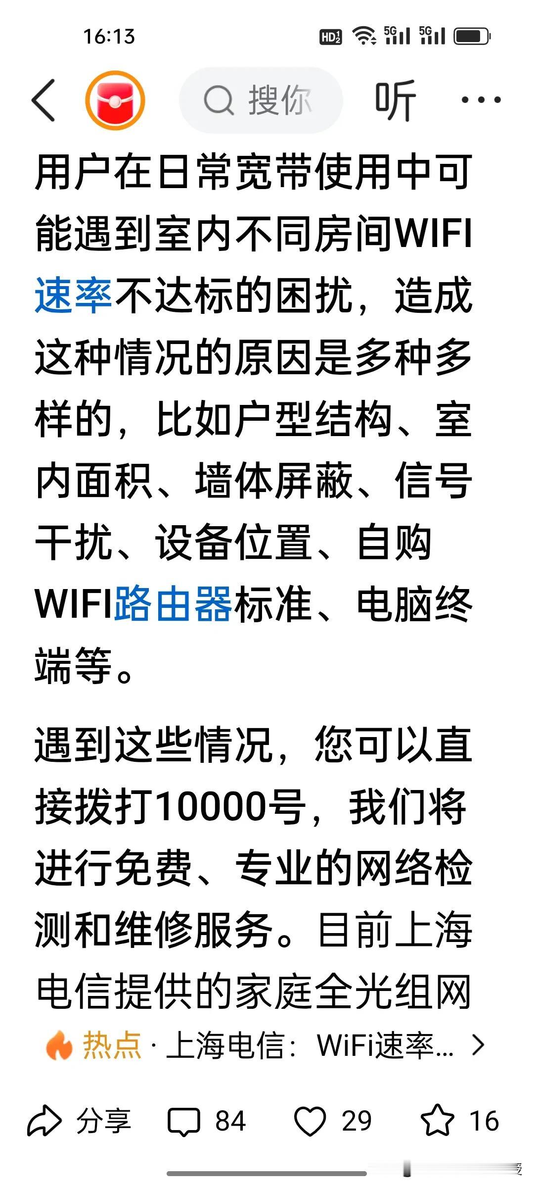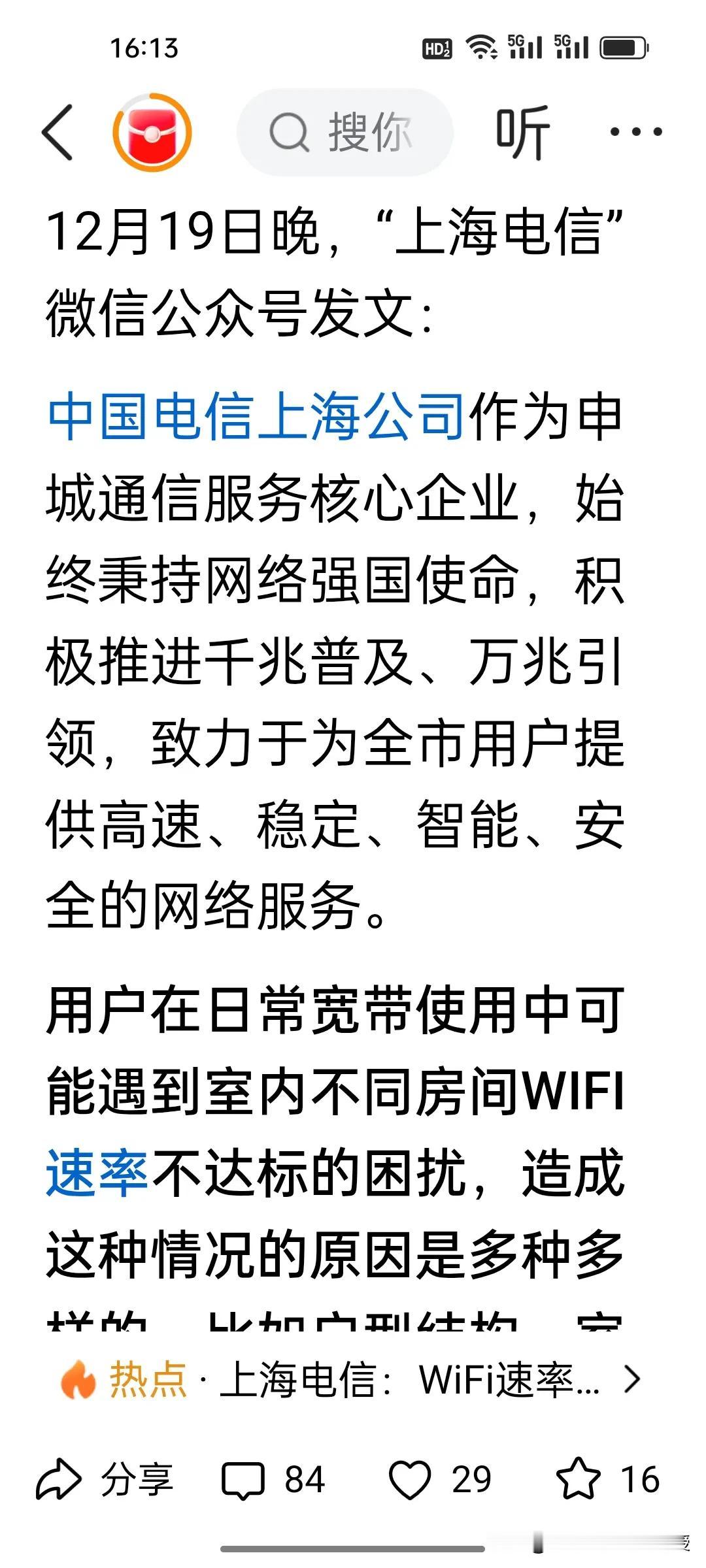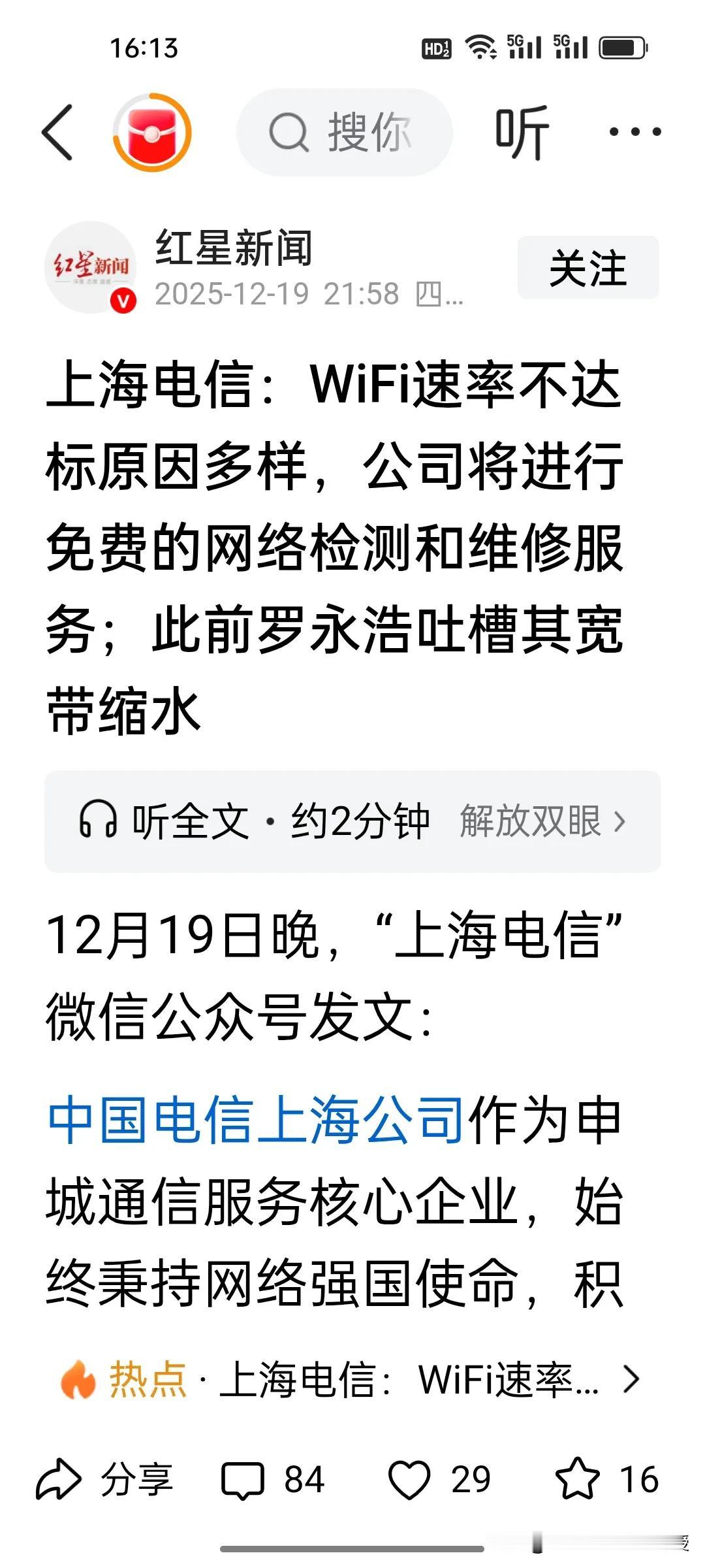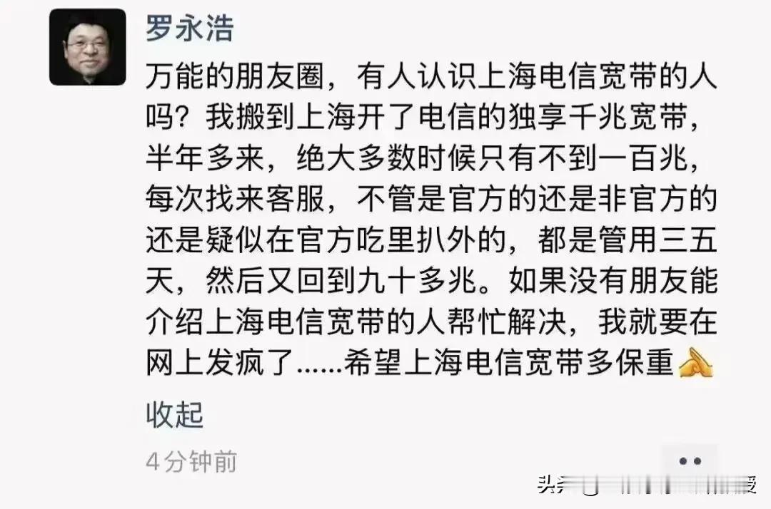 罗永浩吐槽民企,酒店,昨天又吐槽上海电信的千兆宽带速度慢。上海电信坦诚面对,态度好的无懈可击,滴水不漏,发了一份解释函,说会上门给免费检测维修,还说了宽带慢的原因,这不是甩锅,就是纯粹普及宽带慢的原因。这下罗永浩应该没脾气了,“六边形战士”没法再回怼了。 不过罗永浩这一发声,引来很多网友共鸣,确实很多家庭装的千兆宽带都会存在宽带缩水的问题。