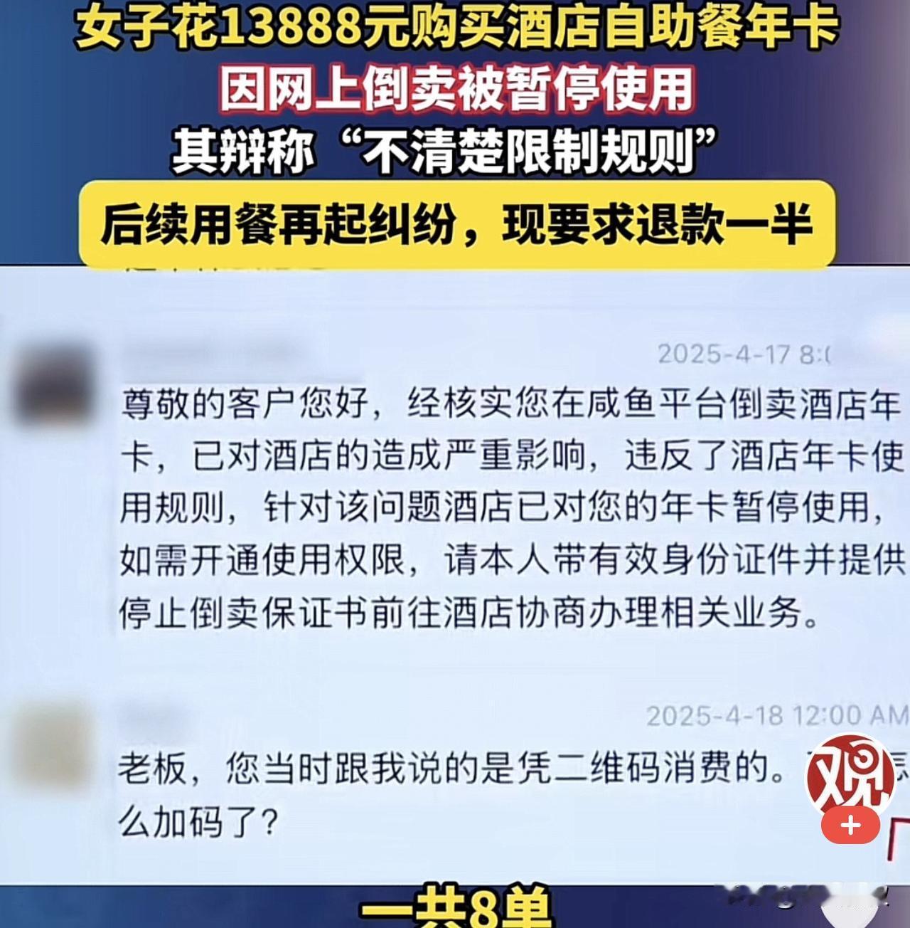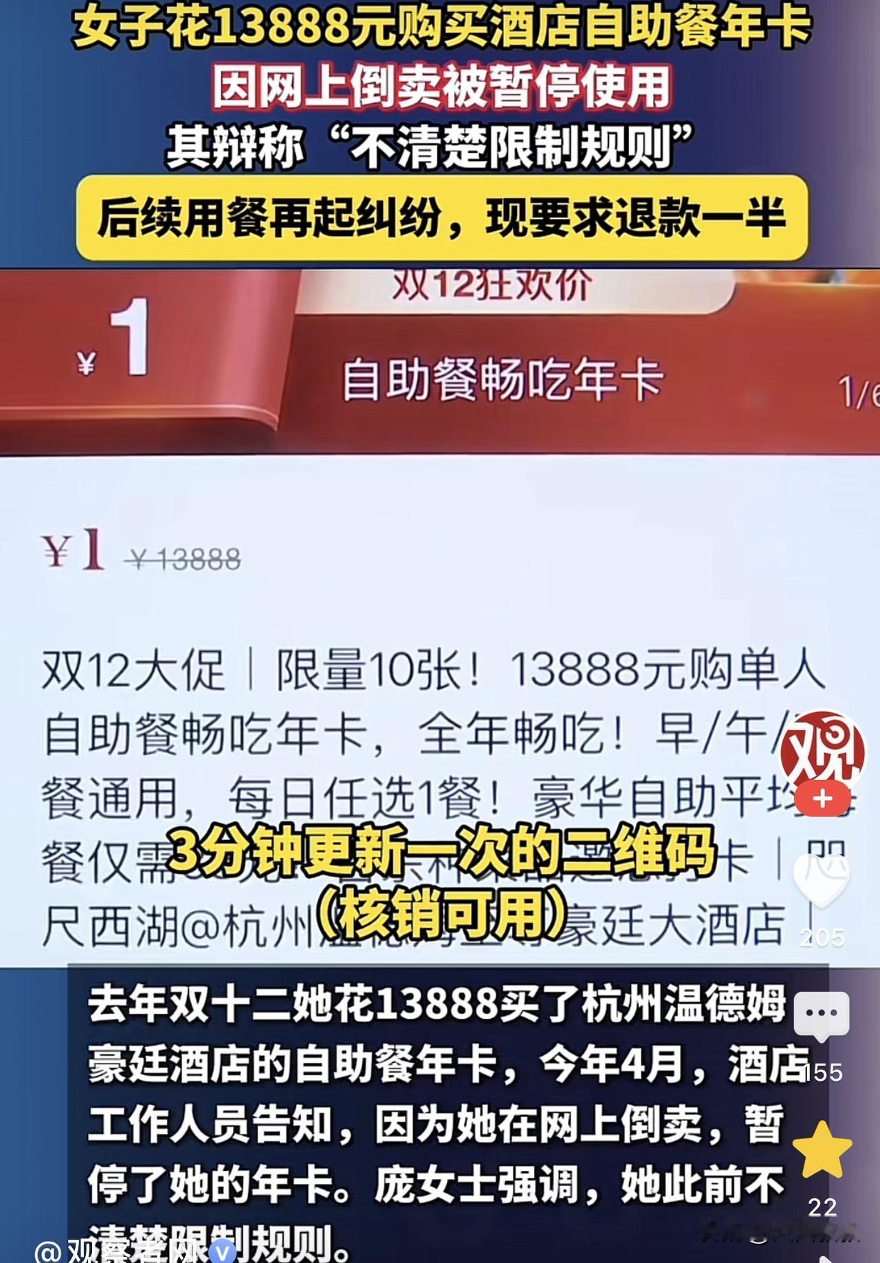 浙江杭州,一女子花了13888元购买了高档酒店的自助餐年卡,用了一段时间后,结果却发现年卡被酒店给暂停了,女子质问酒店为何要暂停自己使用年卡,酒店表示是因为女子在二手平台出售引发纠纷故而暂停,谁知女子却表示自己不清楚规则。结果事发后网友纷纷倾向于酒店的做法。 据悉,庞女士之前租房居住,因为自己做饭被房东限制,于是便在小饭馆吃饭,期间因为用餐发生疑似食物中毒的事件后,庞女士就选择了高档酒店吃自助餐。 一次庞女士得知,一家高档酒店提供年卡服务,年卡13888元,换算下来一顿饭只要38元,这很优惠,于是庞女士就办了这个酒店的自助餐年卡。 此后,庞女士在二手平台上发布了出售酒店自助餐,前前后后,庞女士一共卖了8单,在这之后,庞女士的年卡就被酒店给暂停使用了。 酒店给出的理由是庞女士涉嫌倒卖年卡使用,违反了使用规则,而且还引发了消费纠纷。 对此,庞女士表示自己不清楚年卡使用规则,自己倒卖虽然是事实,但是却只卖了8单,挣了800块钱。 酒店拿出了年卡使用规则称,年卡仅限本人和亲友使用,但是杜绝二次使用。因为有客人在二手平台投诉过庞女士,我们介入后多次告诫庞女士不要再倒卖了,她还是在倒卖。 在这之后,庞女士带着朋友来吃自助餐,结果因为餐费问题,酒店报了警称庞女士吃霸王餐,因为朋友那部分不算是年卡支付部分,所以,双方因此发生了争议。 据此,酒店表示愿意给庞女士延长使用期限,但是庞女士却表示,要求退还一半费用,对此,庞女士已经将此事反应给了市场监管部门。 事发后,网友纷纷调侃,如果是我,我肯定不去倒卖,我就让亲朋好友轮流去吃,一年到头不缺这一顿。 还有网友表示,这会做生意,以价低买了年卡,倒卖一顿酒能赚钱,就算卖50吧还有挣,人家酒店能愿意吗? 也有网友说,总体觉得酒店没什么大问题,而且酒店已经明确说了不能倒卖,她还做,人家给她暂停就没有问题了。 其实,民法典规定,依法成立的合同,仅对当事人具有法律约束力, 当事人对合同条款的理解有争议的,应当依据按照所使用的词句,结合相关条款、行为的性质和目的、习惯以及诚信原则,确定意思表示的含义,确定争议条款的含义。 如果庞女士在年卡使用规则上签字确认,那么,双方虽然发生了争议,酒店单方面停掉庞女士的年卡似乎也符合规则要求,对此并无问题。 但是,如果庞女士确实不知情,不知道这个年卡只能自己使用和亲友使用的,双方发生了争执,那就要按照平时的习惯以及诚信原则,来确定使用规则了,也就是说,我买了年卡有无权利给第三方使用,按照平时的习惯来说,酒店似乎就无法阻止再转手了。 目前,庞女士已经将此事反映给市场监督部门,其实,市场监督部门也只能是调解双方纠纷,调解不成的,双方还是要走司法程序,这对庞女士来说,显然是不利的。 对此,你对本案有什么看法? —————————— 关注我,带你评析法律热点,关注冷暖人生。 文章原创,抄袭必究