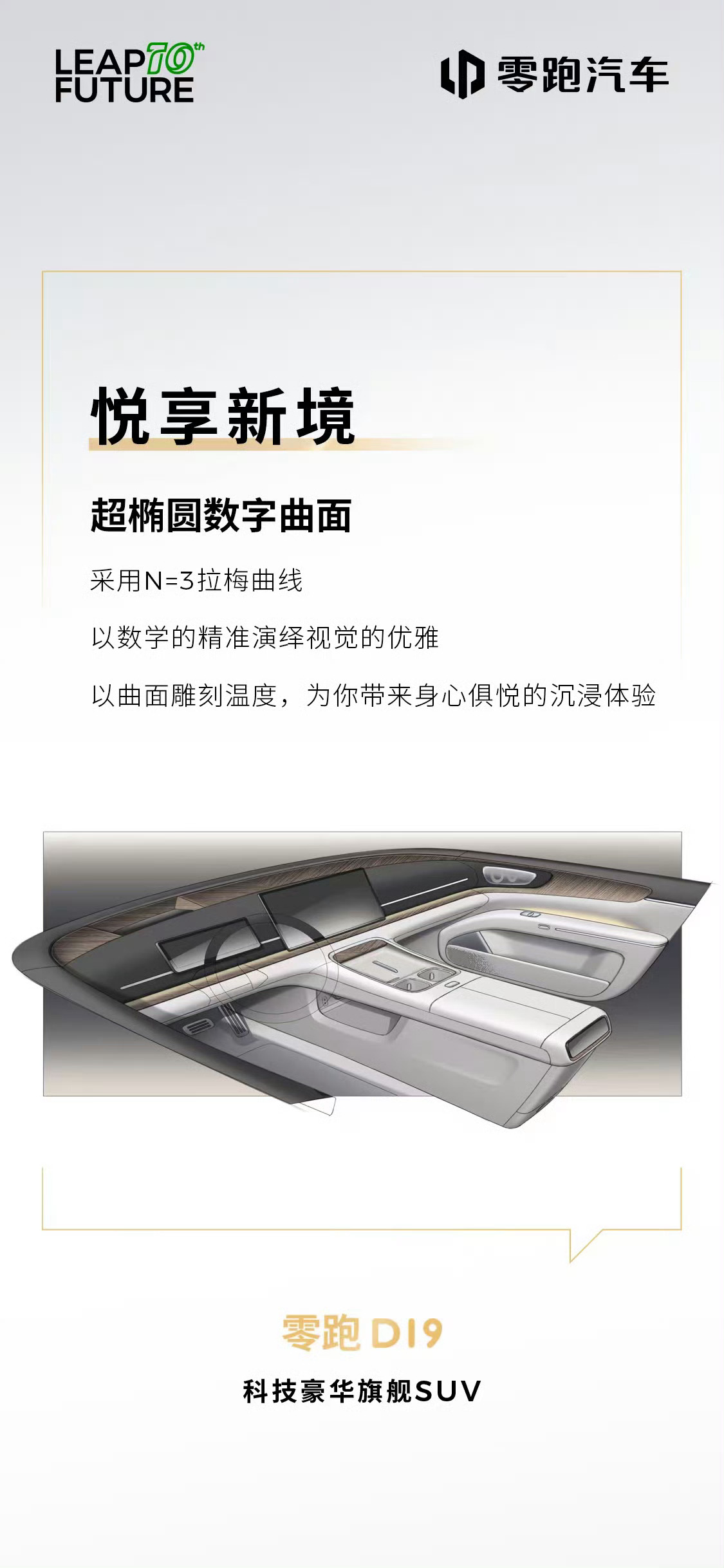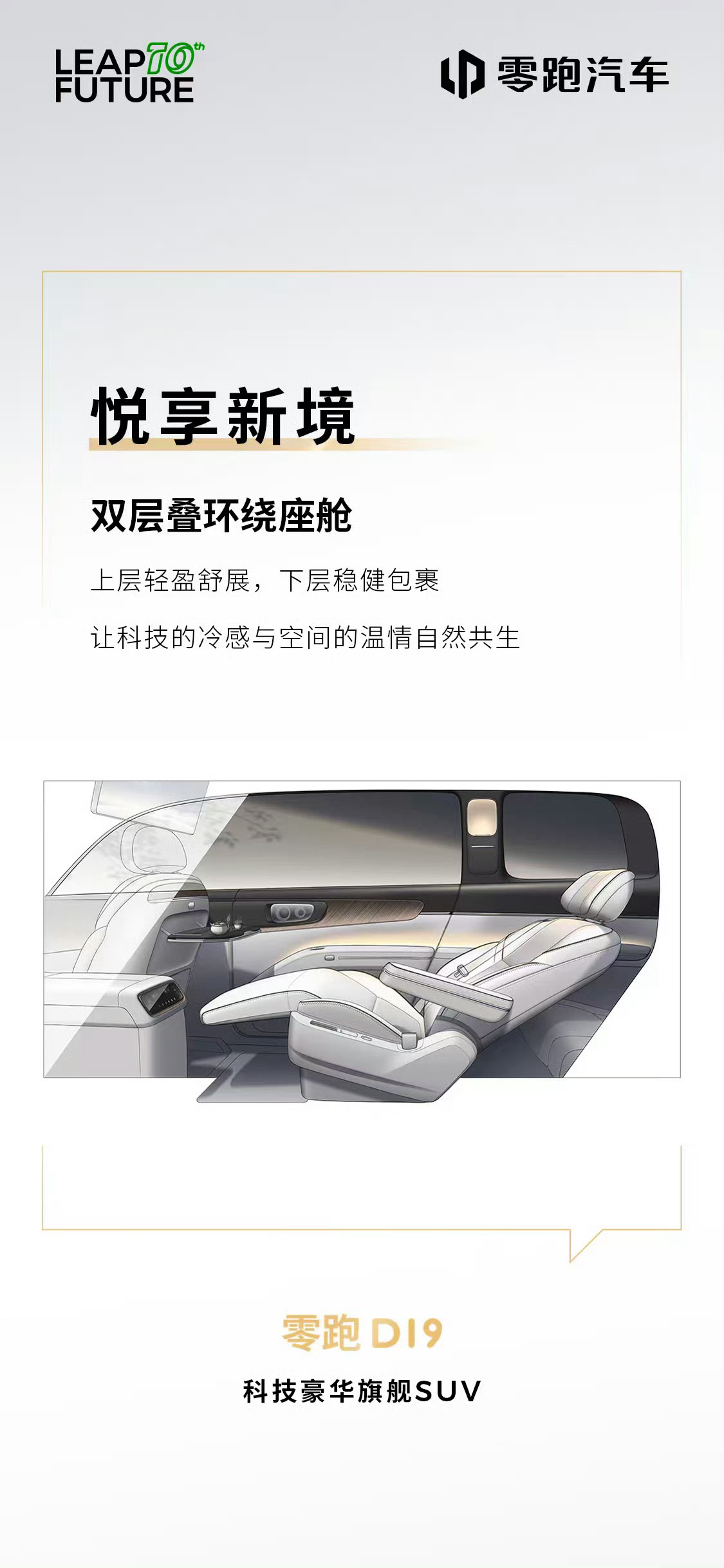 二排零重力座椅,前排没有采用大联屏零跑D19应该是大家最期待的大型SUV之一了,毕竟增程版本就有80度大电池,看着我都有点心动了。零跑d19 回到内饰,9系的沙发,彩电,冰箱一样没少,在B柱上加入一个暖色灯,除了这些内饰应该还有不少细节阿远说车