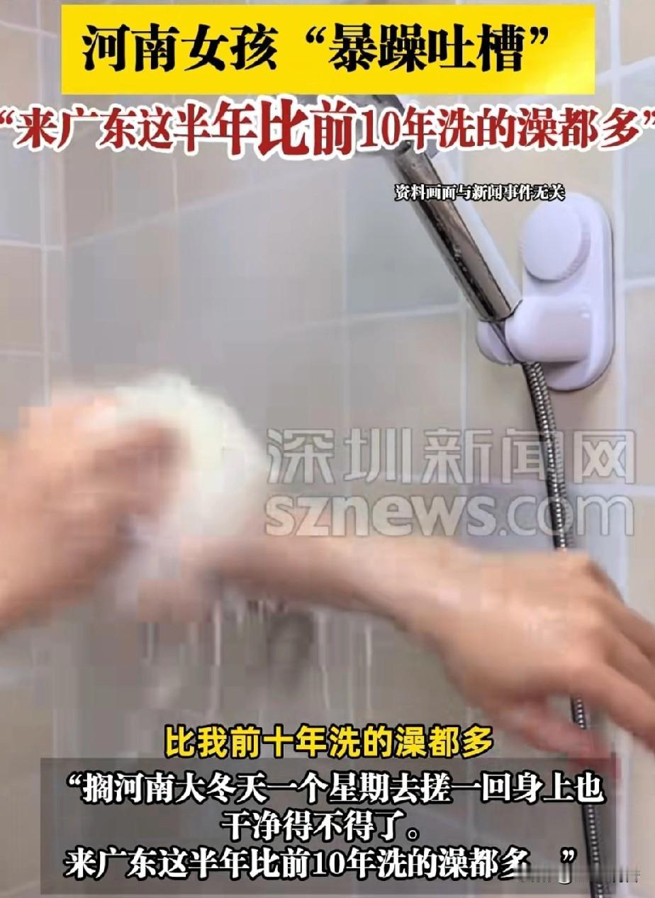 南北文化的差异和南北习俗的差异,导致了南北人民不同的生活习惯,河南女子来广东半年,其言;这半年洗澡的次数比在老家长这么大洗澡的次数还要多。能说出这话,说明北方人的个人卫生习惯是不多么的不堪呀。但是有专家说每天洗澡不利于身体健康,天天洗澡的危害通常有破坏皮肤屏障、导致皮肤干燥、导致皮肤炎症、引起皮肤病。天天洗澡能把每天身体上排出的汗臭味洗掉,不然身上排除出体液会影响皮肤。真不知道这个人卫生到底还如何去护理了,是每天洗澡还是每周洗澡,应该看个人习惯吧,没必要什么事都以专家建议为主,其实只要自己觉得身体没问题,哪怕半年洗一次又有何妨呢?