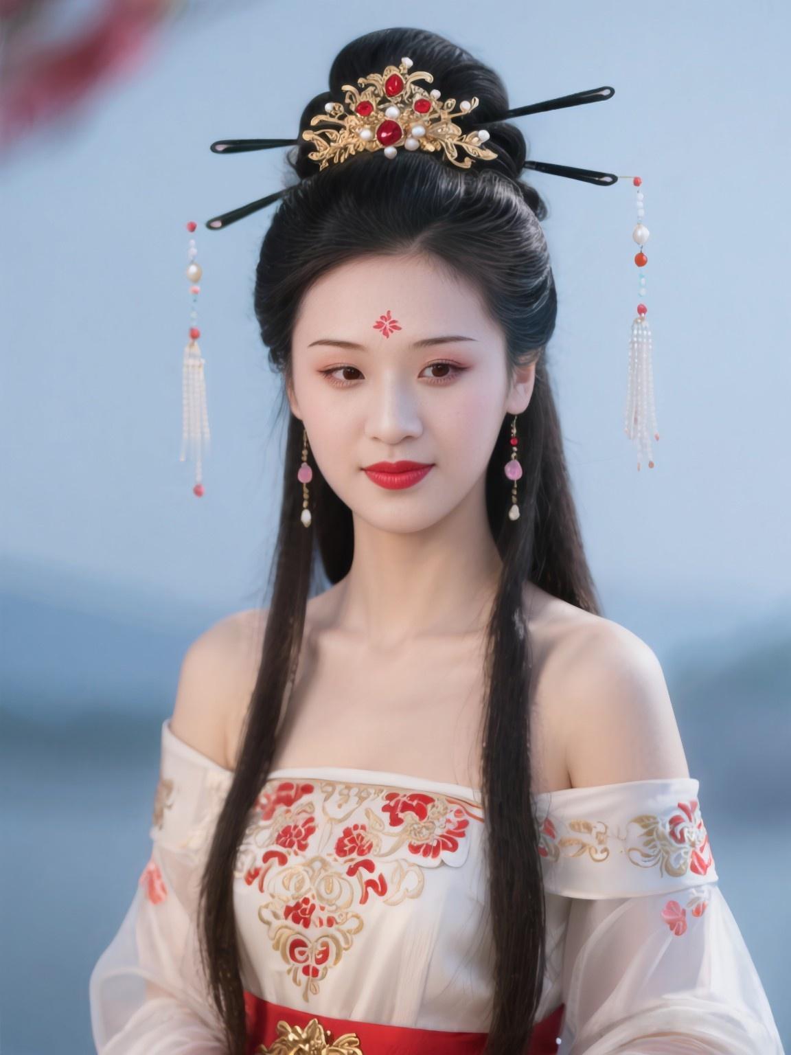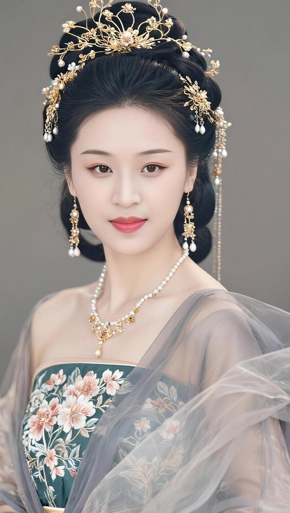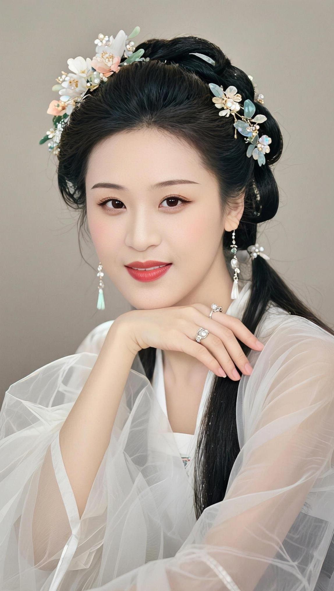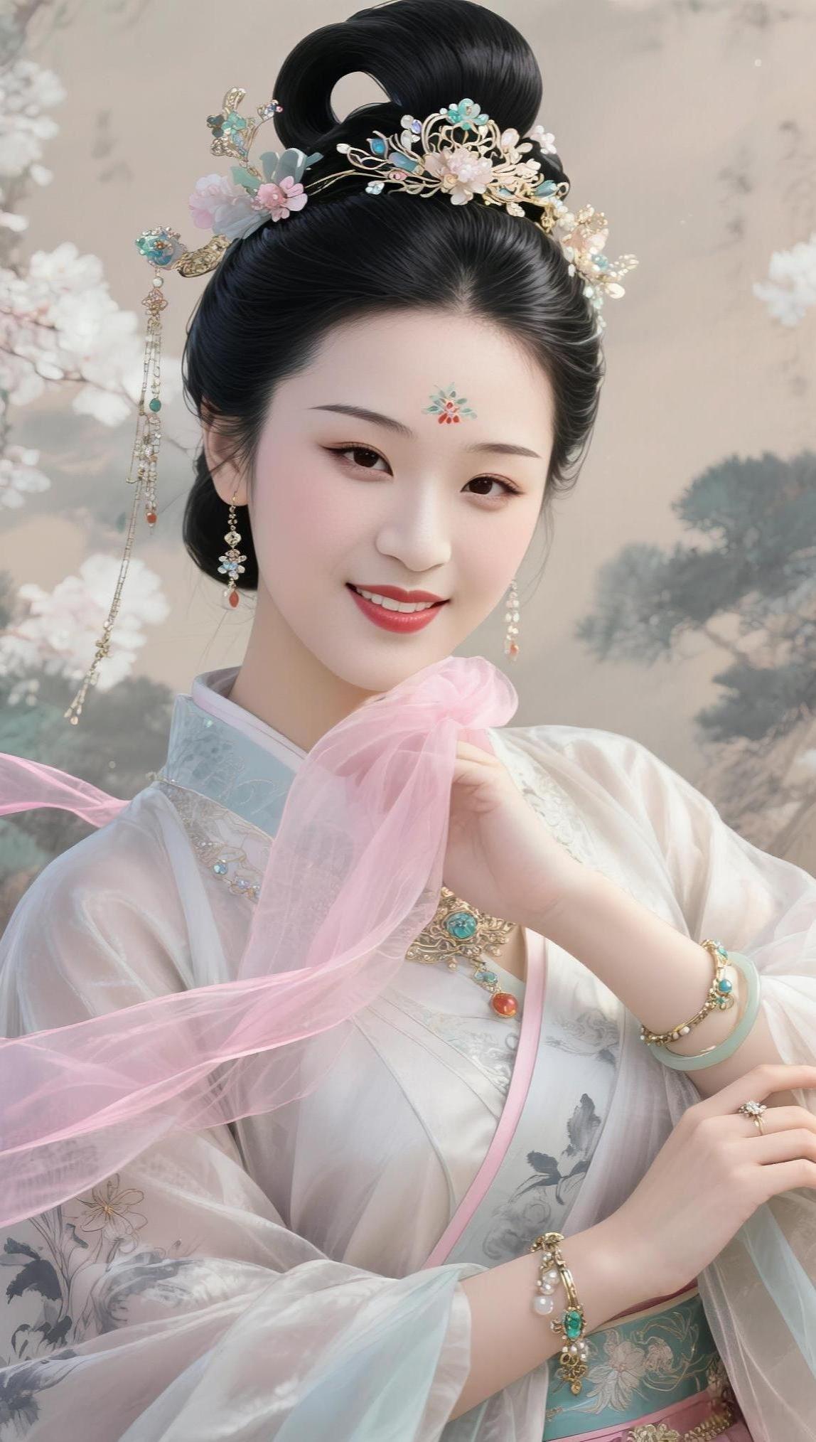 此女只应天上有, 谪来尘世醉芳华。 云鬟斜簪瑶台蕊, 笑靥轻含晓露霞。 翠袂翩跹凝楚水, 金钗摇曳落星槎。 不须仙乐霓裳舞, 一顾江南尽落花。