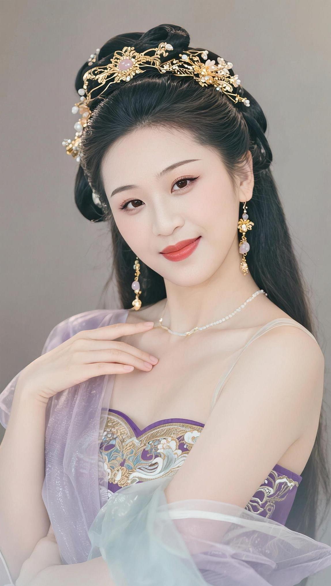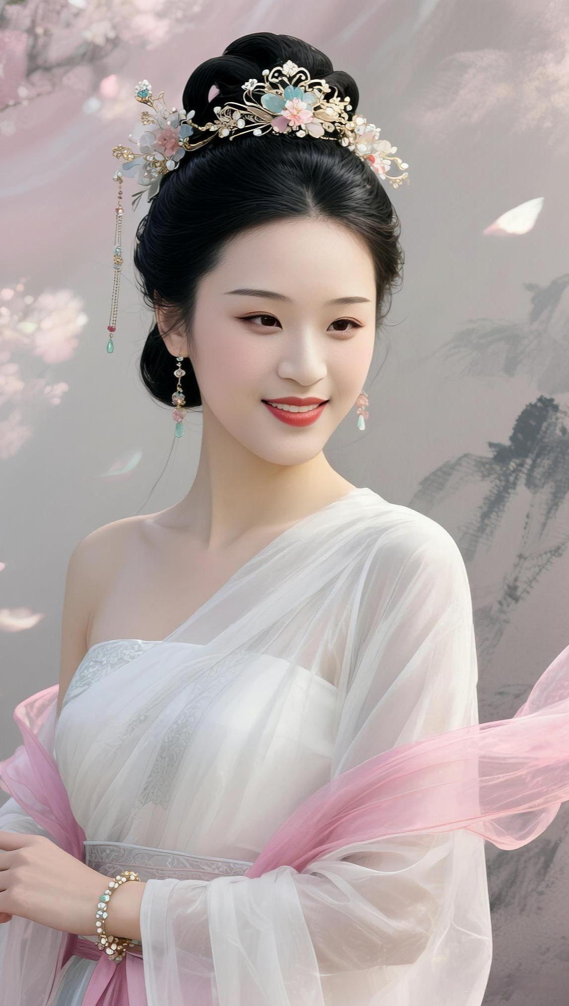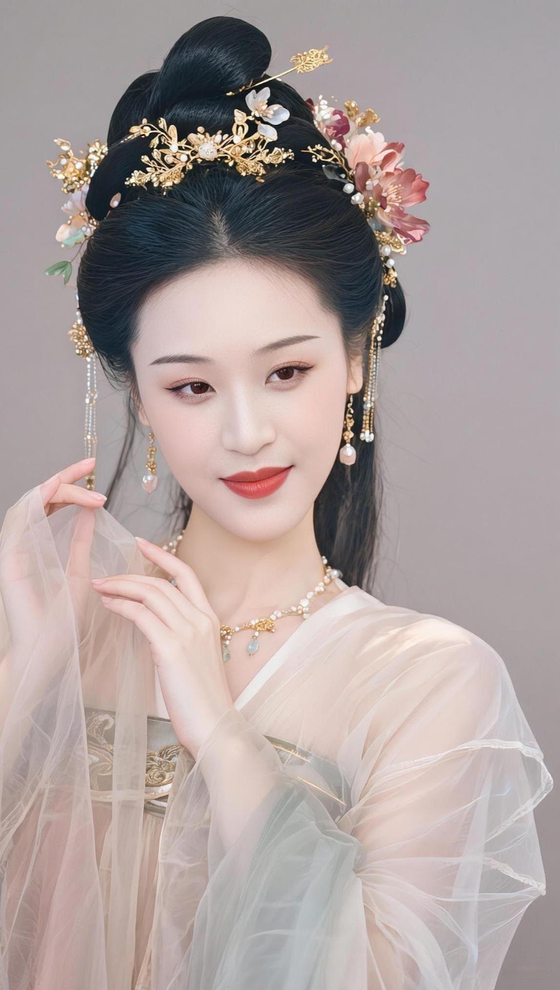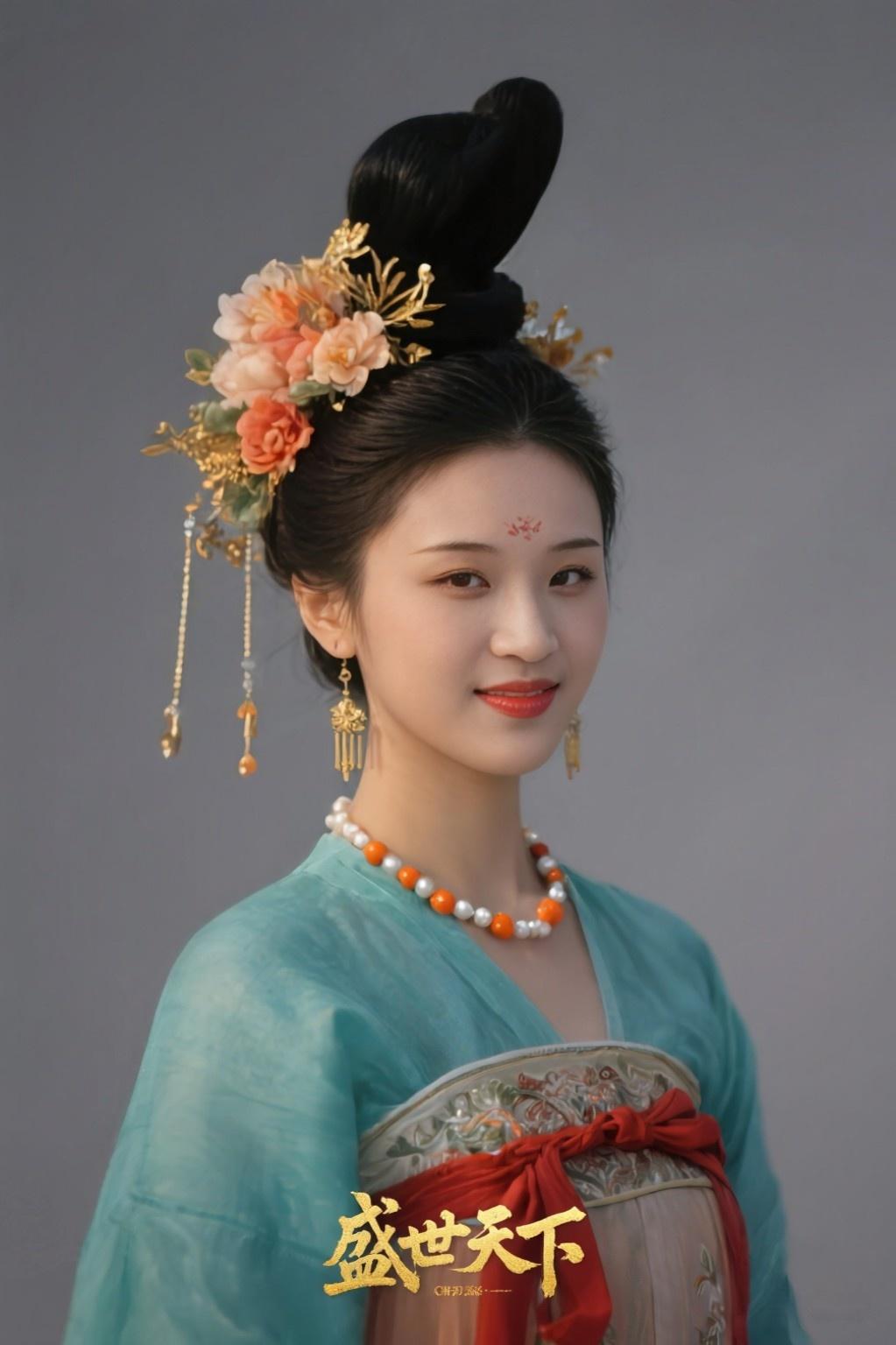 此女只应天上有, 谪来尘世醉芳华。 云鬟斜簪瑶台蕊, 笑靥轻含晓露霞。 翠袂翩跹凝楚水, 金钗摇曳落星槎。 不须仙乐霓裳舞, 一顾江南尽落花。