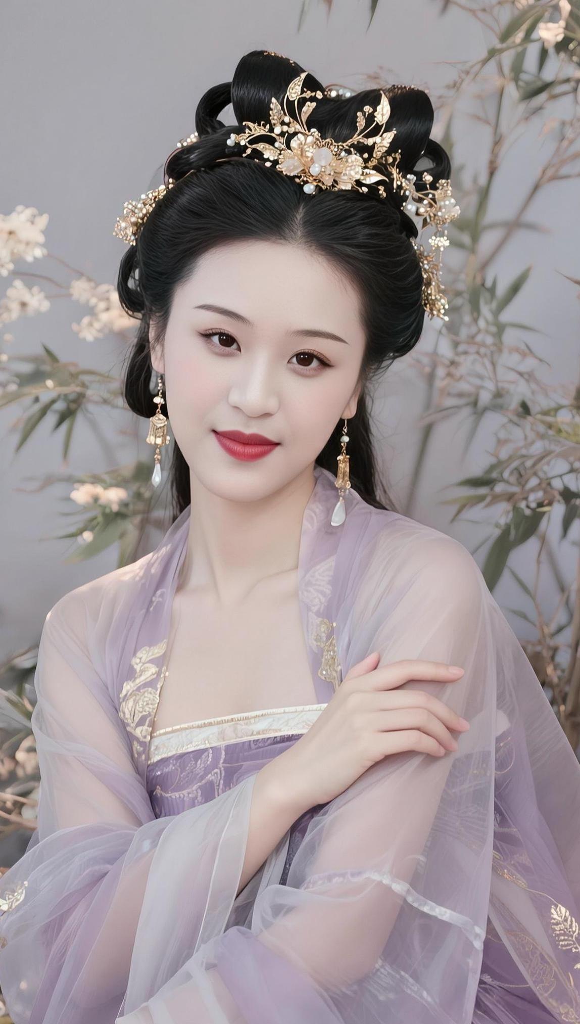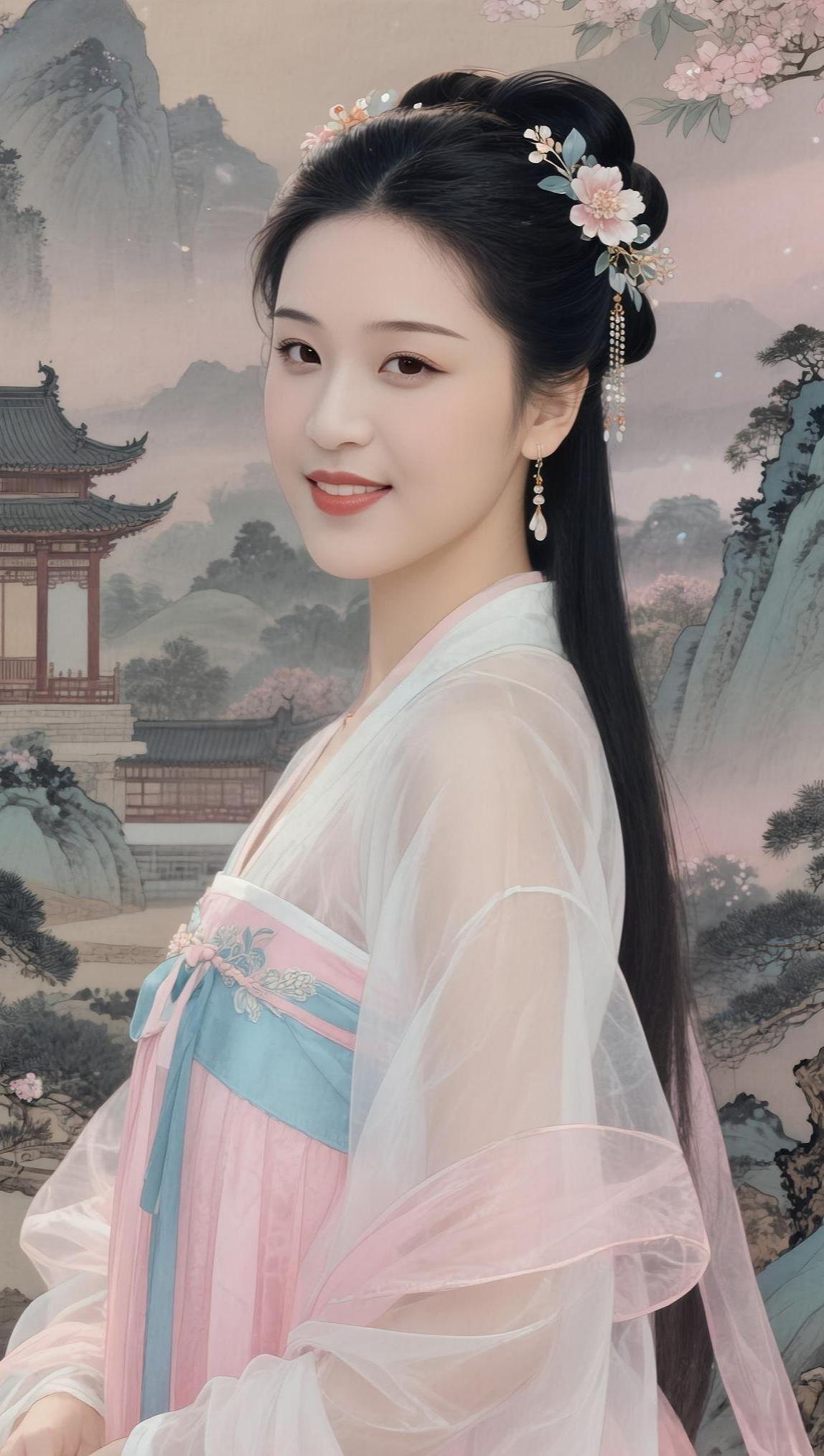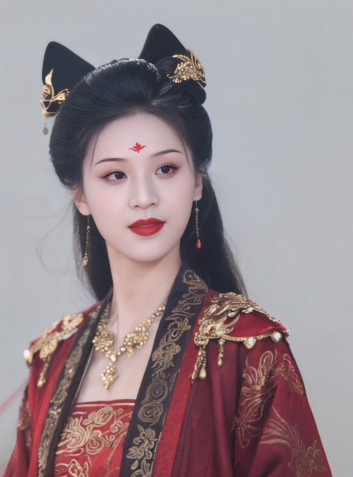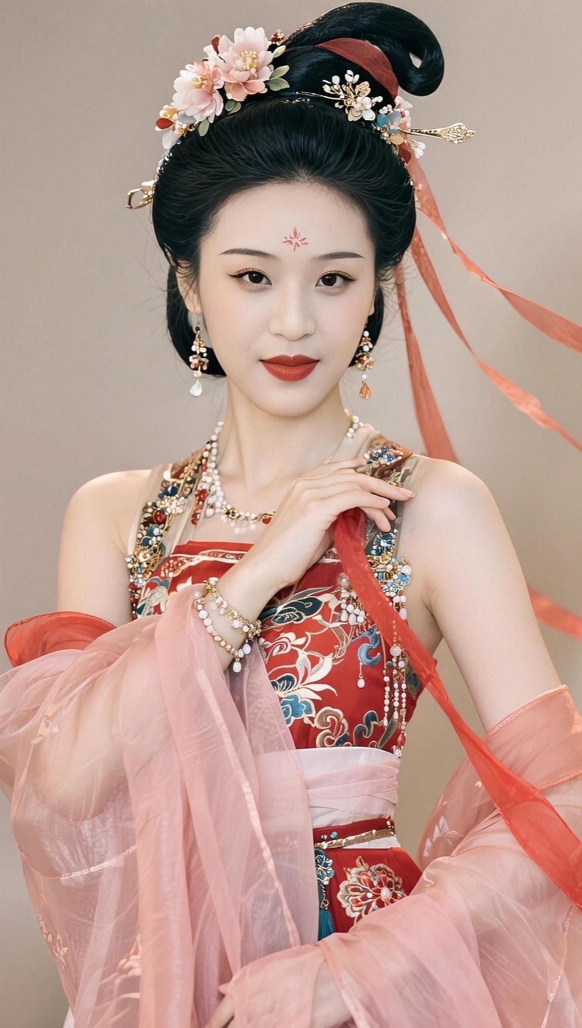 此女只应天上有, 谪来尘世醉芳华。 云鬟斜簪瑶台蕊, 笑靥轻含晓露霞。 翠袂翩跹凝楚水, 金钗摇曳落星槎。 不须仙乐霓裳舞, 一顾江南尽落花。
