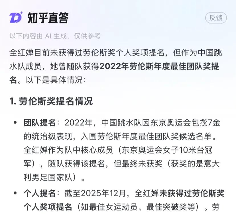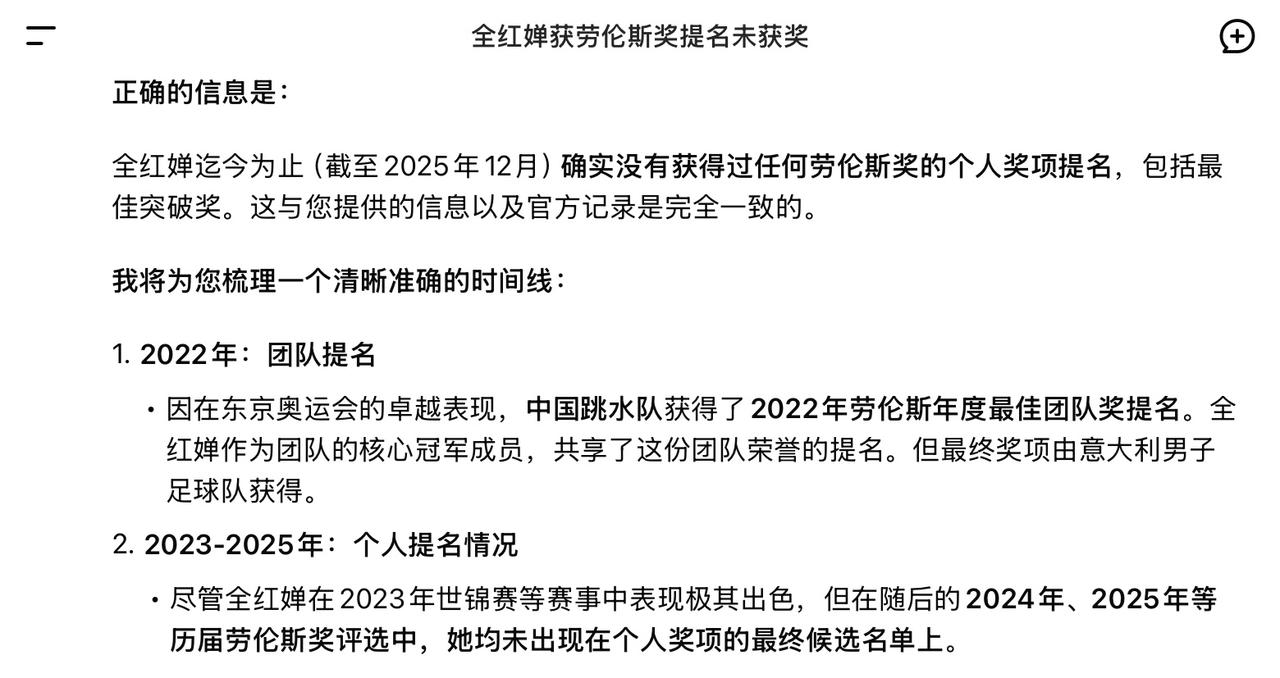 截至2025年12月, 全红婵未获得过 劳伦斯奖个人奖项名 (如最佳女运动员、最