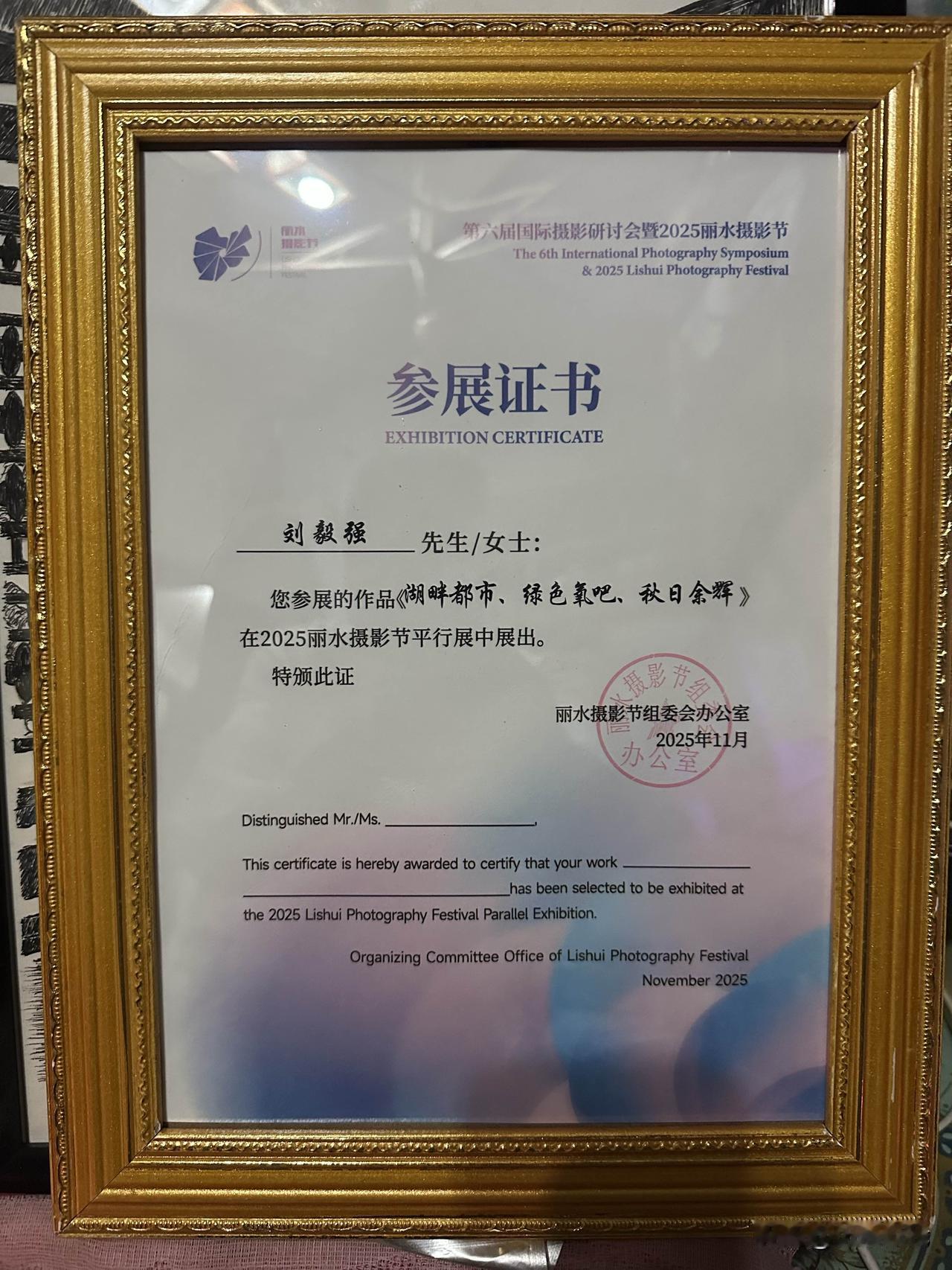 收到丽水摄影节参展证书。