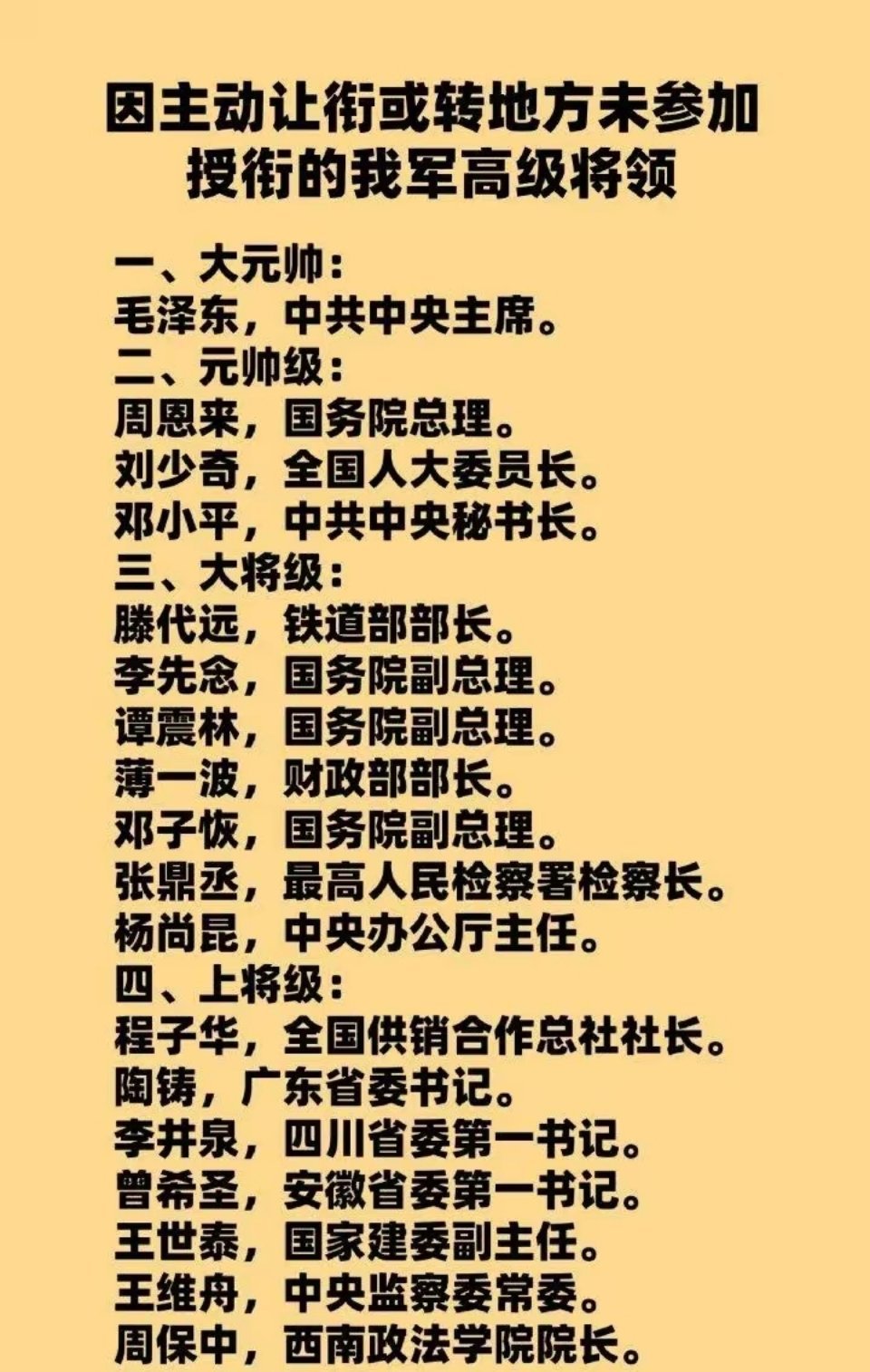 因主动让衔或转地方未参与授衔的高级将领历史知识历史人物