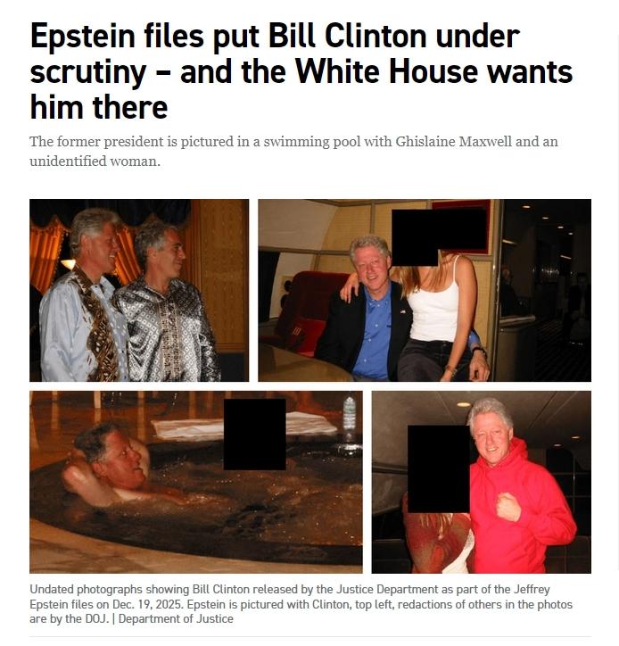 【克林顿被曝与未成年人共浴】据美“政客”网站报道,美司法部发言人查德·吉尔马丁在他的个人X账号上发布了一张部分涂黑的照片,照片中克林顿与一名身份不明的女性在泳池中。 白宫副新闻秘书阿比盖尔·杰克逊在她的个人X账号上更指名道姓:“这是比尔·克林顿在热水浴缸里,旁边是个身份被涂黑的人。根据《爱泼斯坦档案透明法案》,司法部被明确指示仅涂黑受害者和/或未成年人的面部。是时候让媒体开始提出真正的问题了”。 吉尔马丁发布的另一张游泳池照片显示克林顿与爱泼斯坦长期共谋者吉斯莱恩·麦克斯韦尔在一起,麦克斯韦尔于2021年因性贩卖罪被定罪。 目前尚不清楚这张此前未公开的照片拍摄时间及泳池具体地点。 克林顿与爱泼斯坦还有一张合影。右边的照片,坐在他腿上的是一位被打码的女性,看起来像坐在飞机上。 美国副司法部长托德·布兰奇周五早些时候表示,首次公开将是部分的,未来几周内将有多达数十万份文件公布。