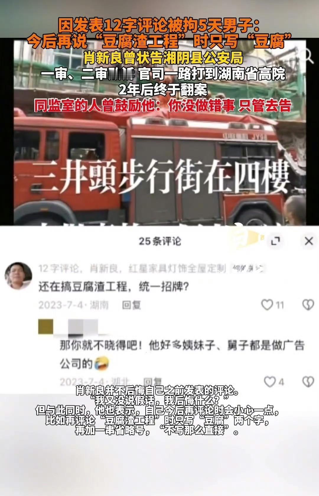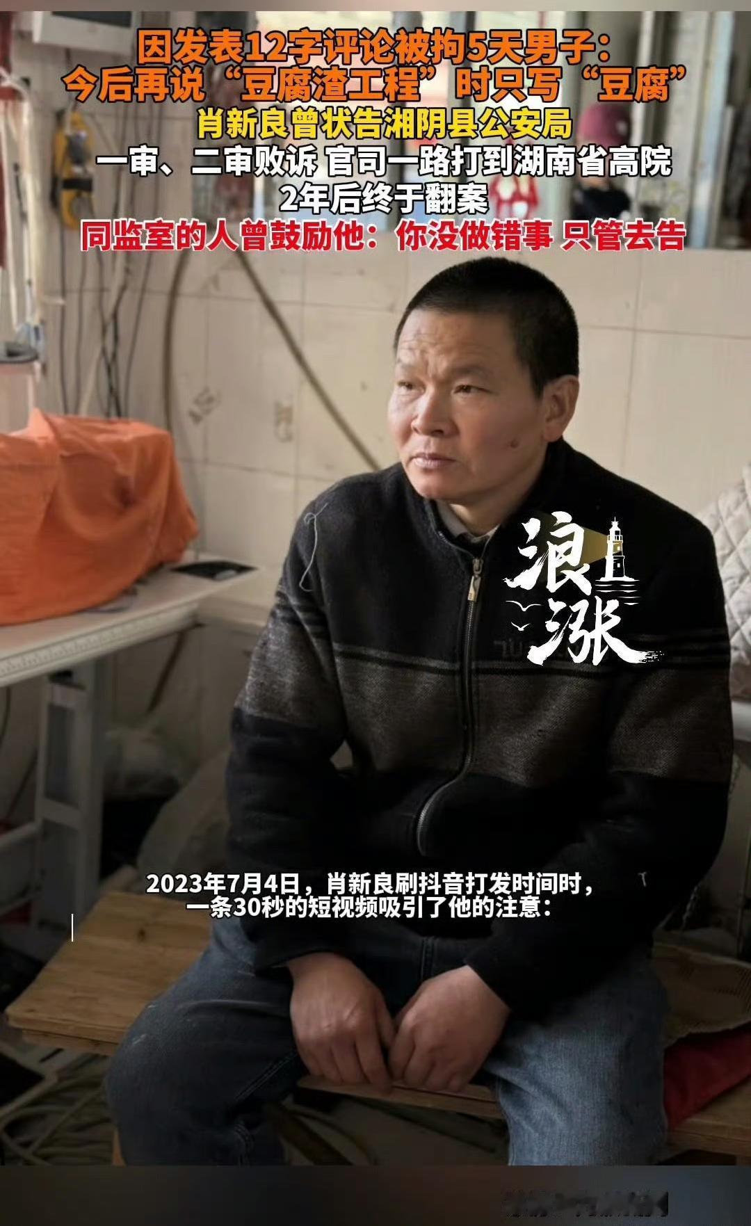 肖新良曾因12字评论被拘留5天,最近接受媒体采访称:不后悔发表评论,以后“不写那么直接”。两年多的维权之路让肖新良心力交瘁,其妻子称感觉到他“没那么多话了,好像有了抑郁症一样”。 如此“简单”的案件,一审、二审竟然败诉,官司打到湖南省高院才翻案。提醒大家,谨言慎行,因评论被拘留的并非孤例。 肖新良事件 拘留决定:湘阴县公安局 一审法院:汨罗市人民法院 二审法院:岳阳市中级人民法院