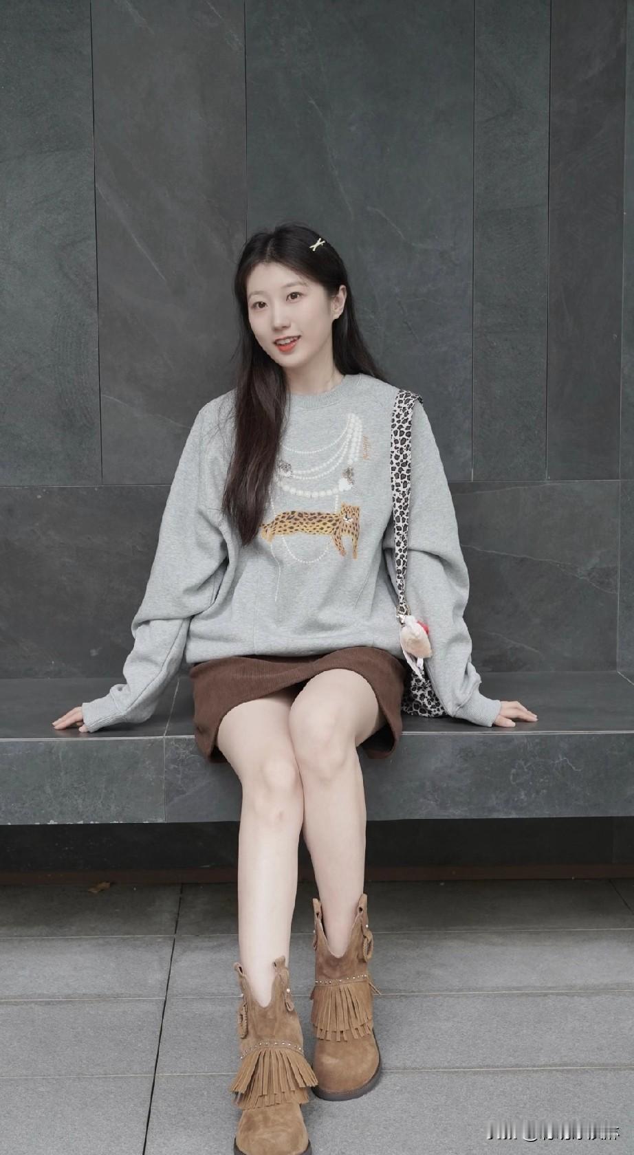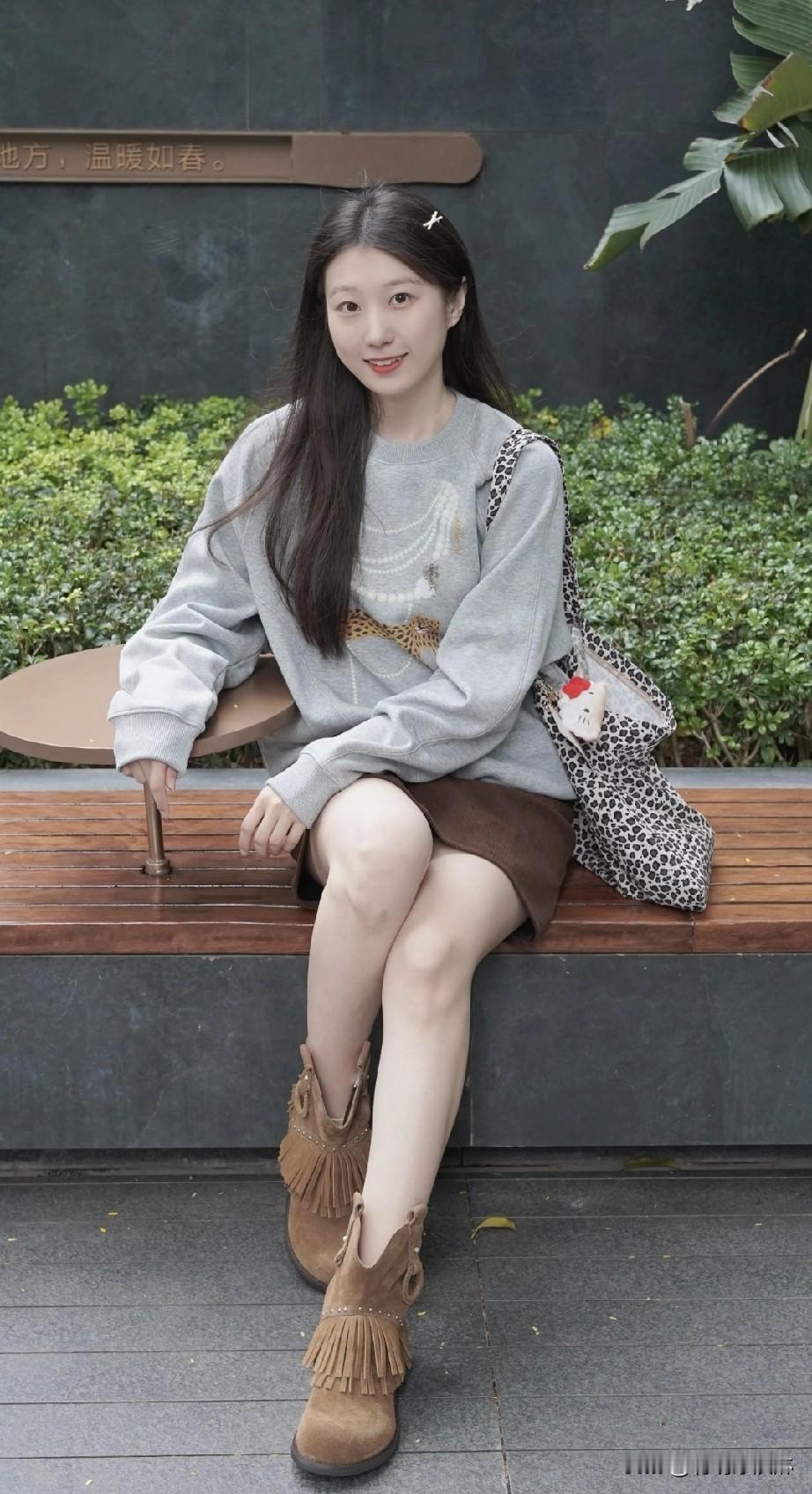 温暖如春的灰色毛衣搭配棕色短裙,脚踩流苏靴,轻松出街。