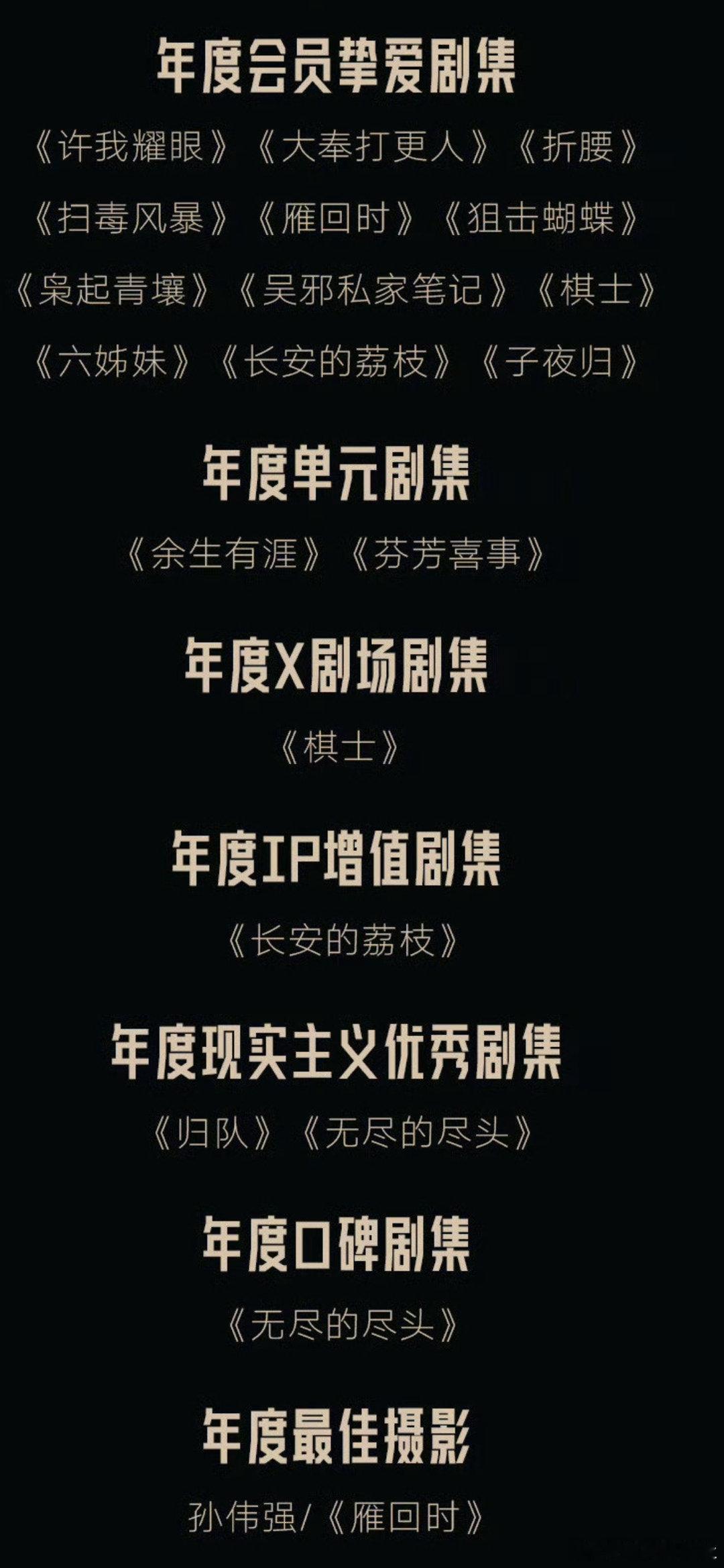 腾讯年度现实主义优秀剧集腾讯年度口碑剧集年度现实主义优秀剧集:归队 无尽的尽头年度口碑剧集:《无尽的尽头》年度最佳视效《子夜归》许凯 田曦薇子夜归年度最佳视效