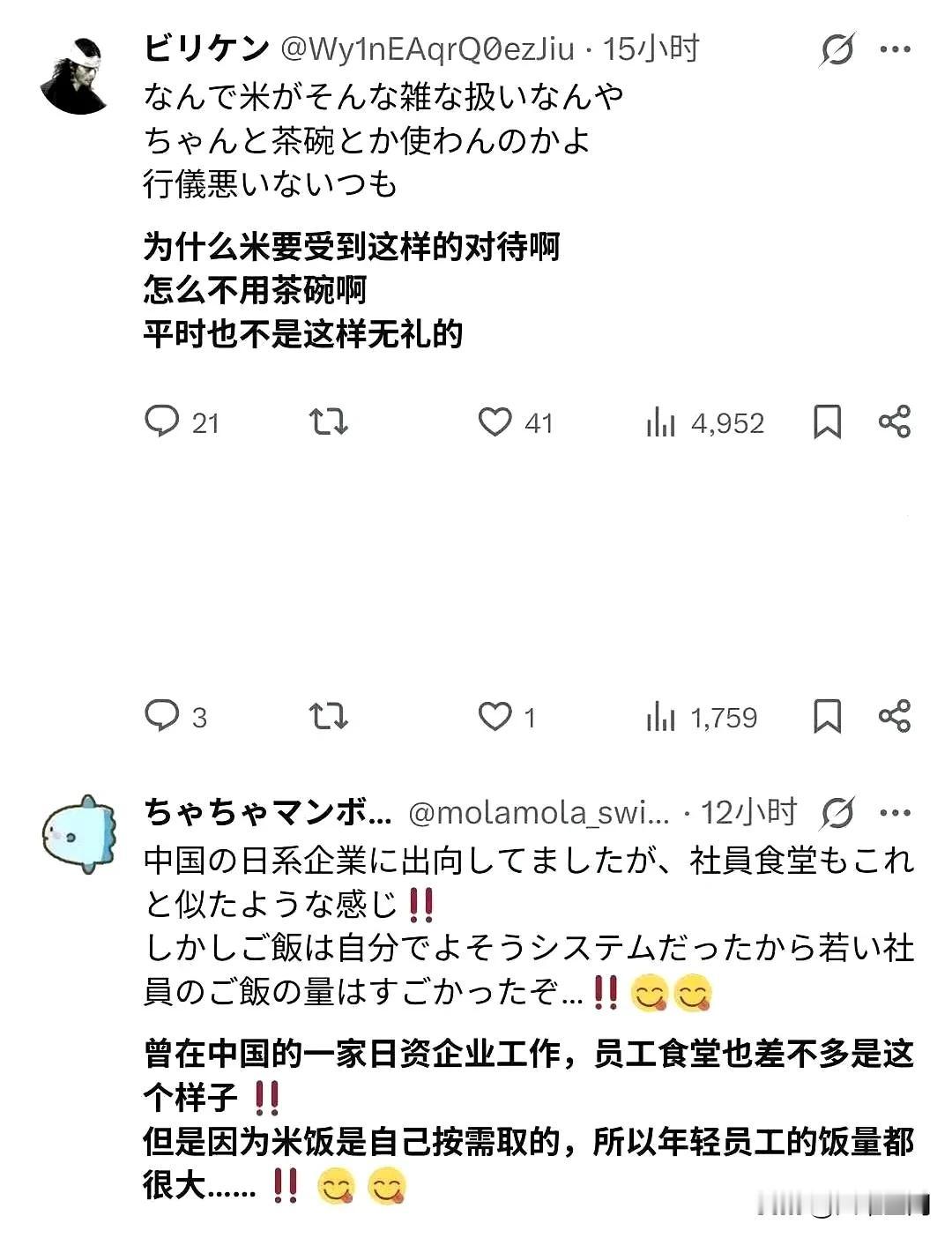 中国学校食堂吃饭的视频传到日本,日本人的反应就是典型的“据小节而无大义”,它们大米都贵到吃不起米饭了,但是它们的关注点是为什么米饭受到这样的对待,为什么不用茶碗,非常无礼!日本不去关注米价贵这种“大义”的事情,反而在关注米饭没有用碗装,这种“小节”的问题,还有的关注是饭量大,我们的正常的饭量,对它们来说是饭量大,可见日本人大米已经贵到它们不得不减少饭量了,你说它们天生饭量小,怎么来中国旅游,个个都胡吃海喝,因为中国吃的便宜,它们就放开了吃!