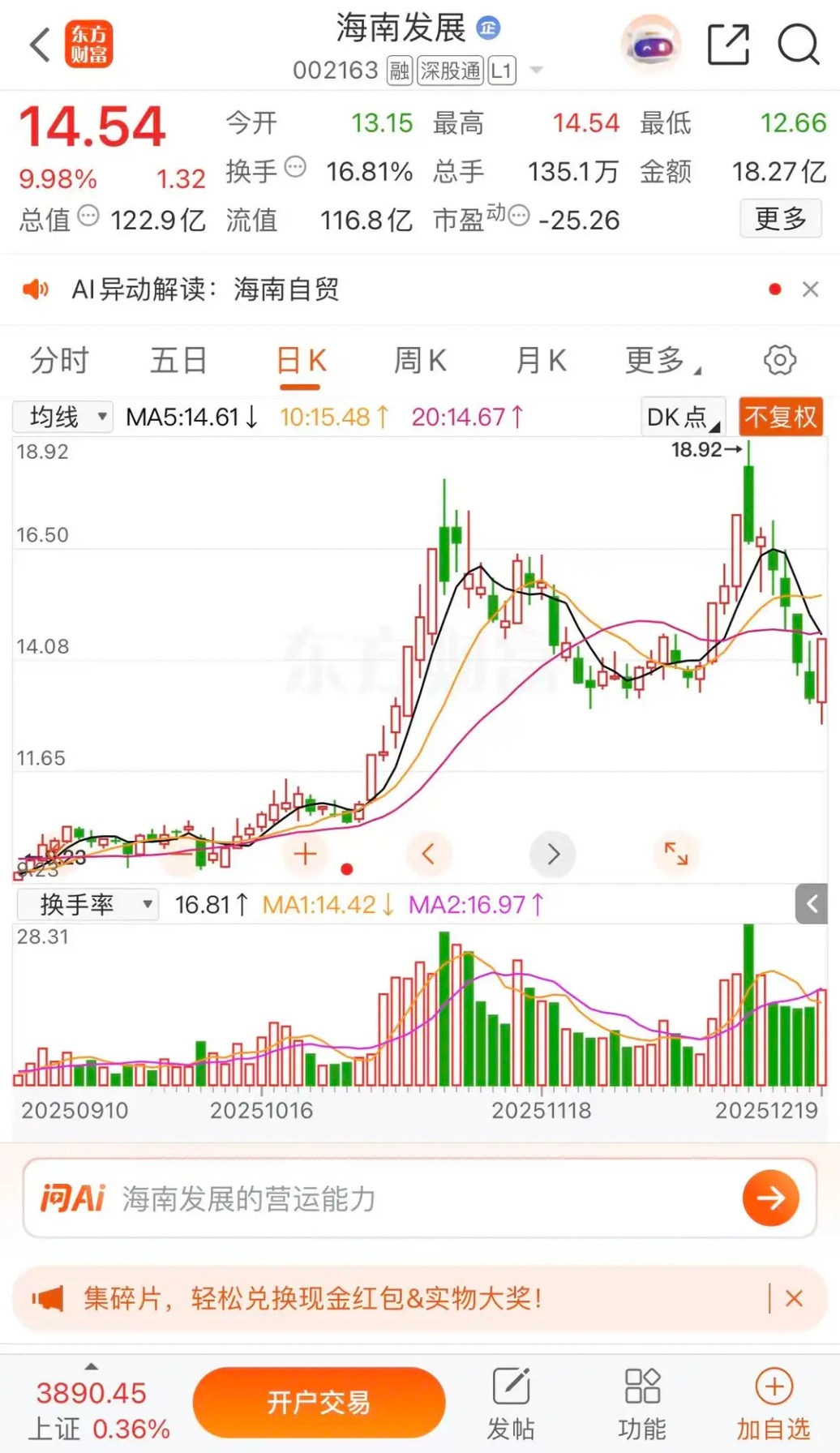 通鼎互联一字板,海南发展,海南瑞泽封关迟来的涨停通鼎互联涨停板收盘报收7.16元每股,成交金额18.67亿元,总市值88.07亿元,100亿市值必定达到,妖股气质。海南发展涨停收盘报收14.54元每股,成交金额18.27亿元,迟来的涨停。海南瑞泽涨停收盘报收5.35元每股成交金额10.92亿元,封关迟到的涨停,周一继续上涨。