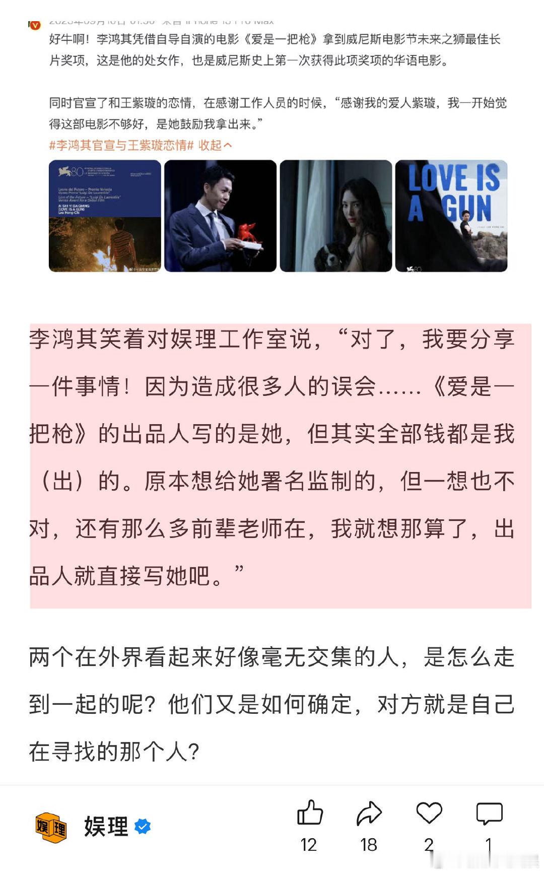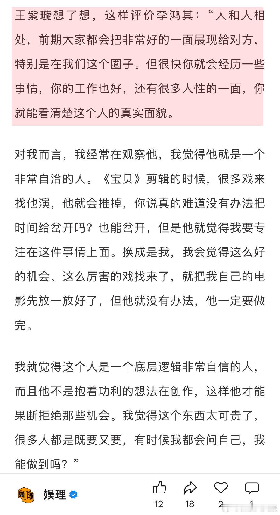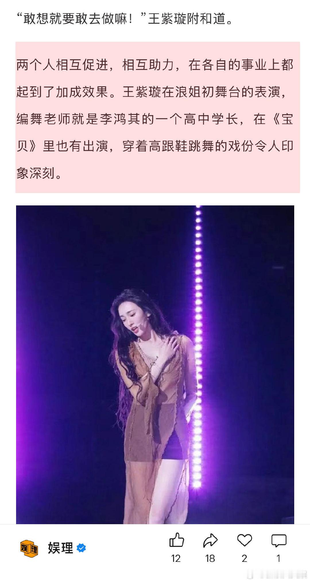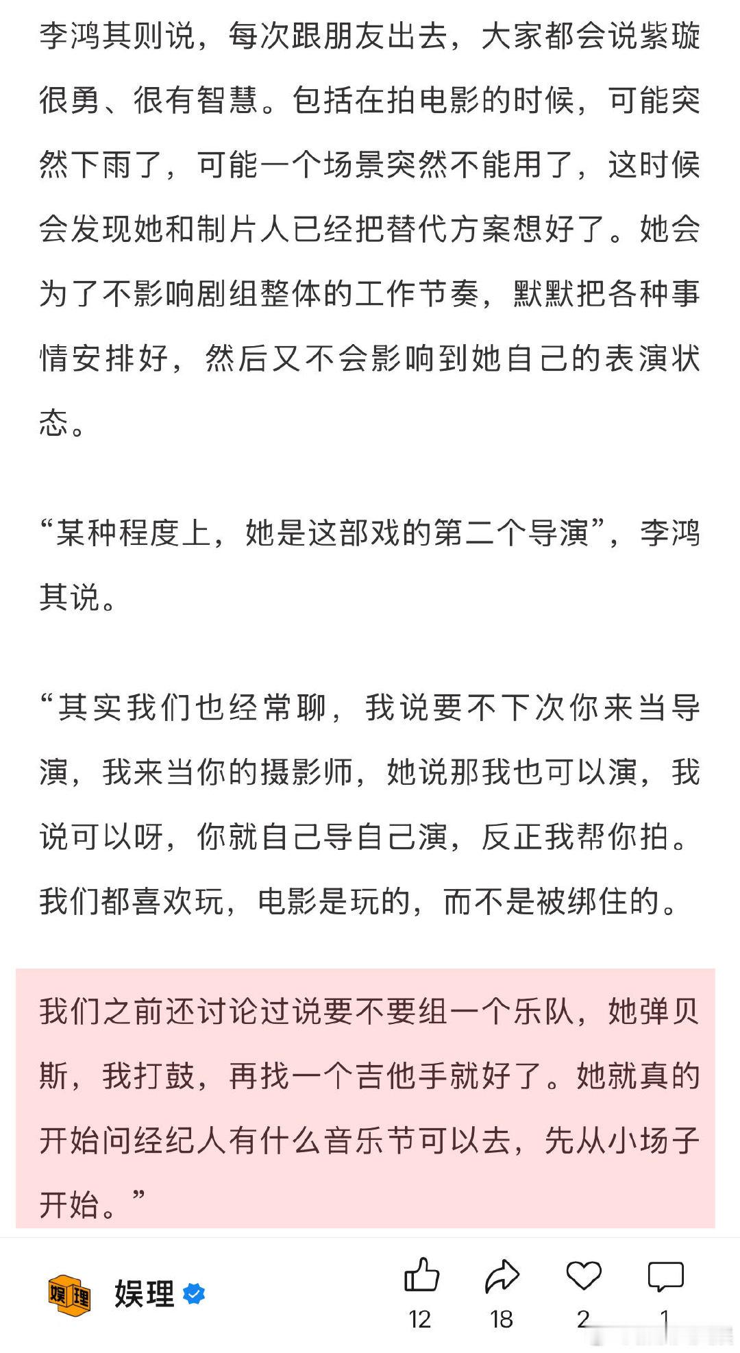 李鸿其王紫璇回应从恋情到结婚 王紫璇李鸿其想组一个乐队 王紫璇眼中的李鸿其是一个底层逻辑非常自信的人,“他不是抱着功利的想法在创作,这样他才能果断拒绝那些机会。我觉得这个东西太可贵了。”李鸿其则觉得王紫璇很勇、很有智慧。“我们之前还讨论过说要不要组一个乐队,她弹贝斯,我打鼓,再找一个吉他手就好了。她就真的开始问经纪人有什么音乐节可以去,先从小场子开始…”娱理独家↓