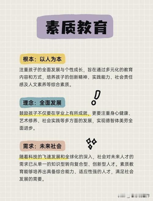 各位家长朋友们,说句实在话,你是更喜欢现在改革后的素质教育呢,还是希望孩子像当初的自己一样应试教育? 我们读书那会,最起码小学阶段还是很轻松的。不用家长接送不用花钱补课不用考体育跳绳不用每天背着那么重的书包。 可是那时候的孩子放了学就撒欢全村跑着玩,有大把时间踢球跑步踢毽子丢沙包跳皮筋。 现如今我们的孩子呢?改来改去这个重要那个重要,于是乎考这个考那个。身体很重要于是猛加体育课,跳绳跑步游泳都要考试。不会怎么办,外面去上辅导班。 下午三点多放学了,家长6点才下班怎么接?花钱课后延时,在学校里多呆一个小时到四点多。还没人接怎么办?花钱找托管班代接! 晚上能轻松点吧?简直做梦。你要辅导孩子作业,检查复习预习情况,还要亲子阅读各种打卡,陪伴孩子共同成长。 更总要的是,还得应对孩子想要手机的软磨硬泡-各种网络游戏专门给孩子定制的,一下就上瘾,分明就是高科技在给家长抢孩子!对素质的理解 素质教育 素质评价 这就是素质教育 社会素质教育 中国应试教育 素质教育手册