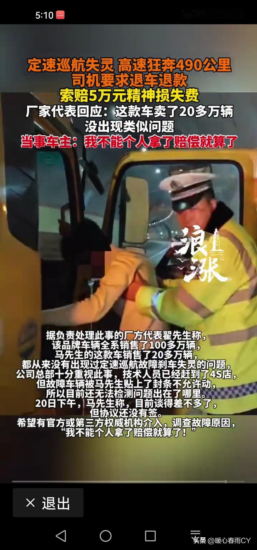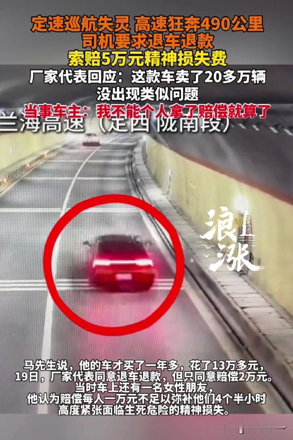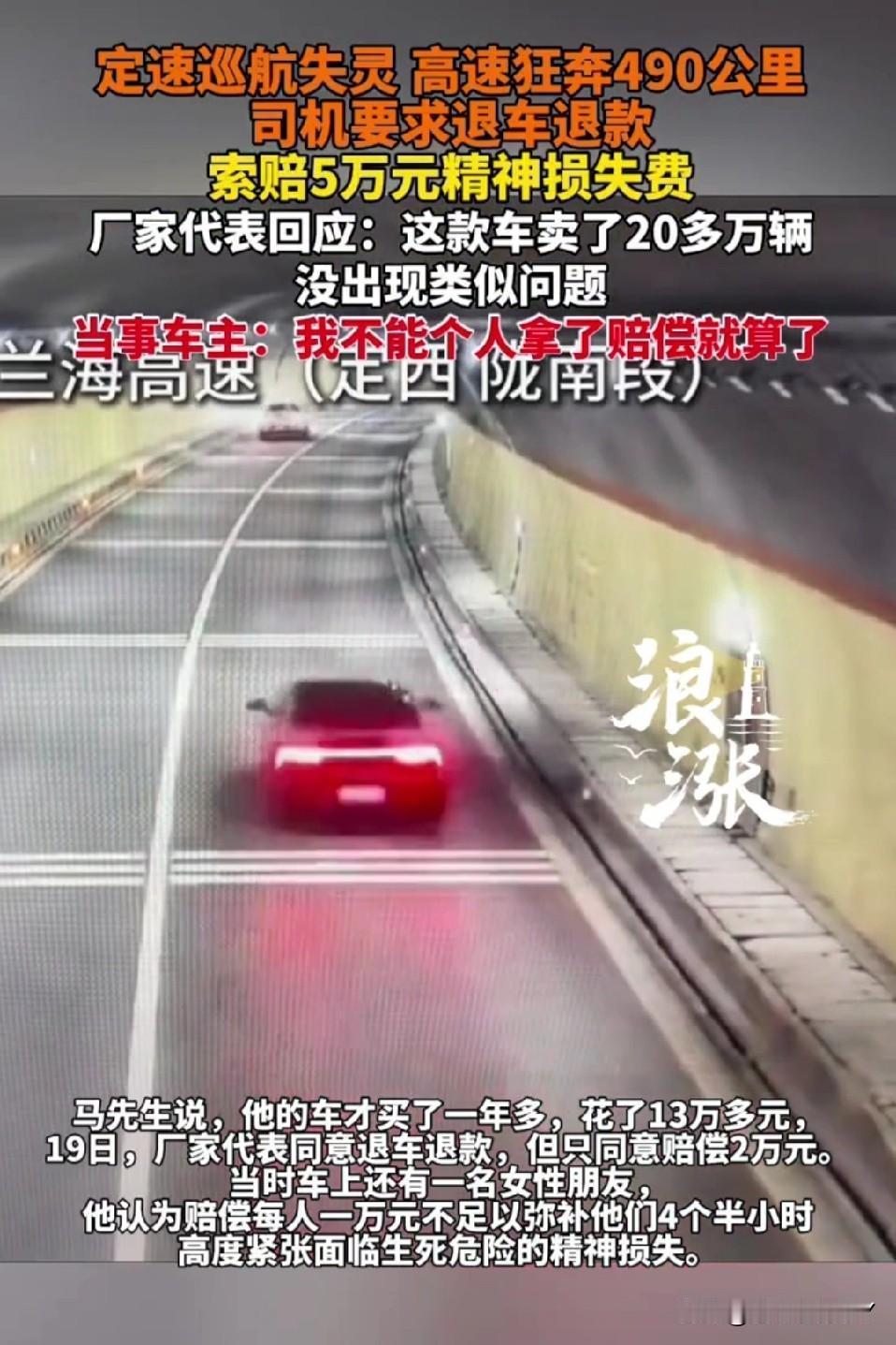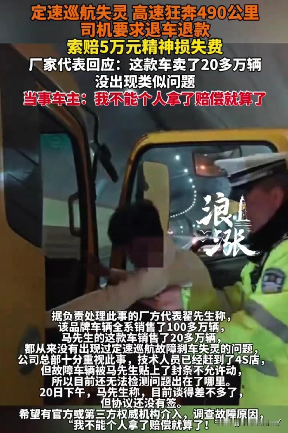 马先生驾车返乡时,开启定速巡航后,该系统突然失灵,刹车也随之失效。 车辆以115码的时速狂奔490公里,历时4个半小时。期间,全靠交警开道、路政护航,直到燃油耗尽才化险为夷。 这车刚买一年多、花费了13万的车、可把同行者(女性)吓得大哭,马先生也浑身颤抖。 协商时,厂家起初愿退车并赔偿从2万,后涨到4.5万,但要求马先生签保密协议。 马先生直接贴封条锁车,拒绝拿钱封口,他说:“不能我安全了,就不管其他的车主。” 厂家称该车已售出20多万辆,从未出现类似问题。 可行车安全容不得半点侥幸,相信大家开车时都怕遇到故障。 期待第三方彻查此事,给所有车主一个明确说法。 G75兰海高速