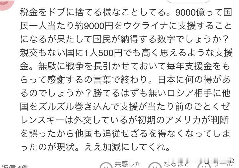 日本媒体报道:乌克兰总统 “泽连斯基”发表声明表示感谢 日本政府来年追加的财政支援。 日本政府这个月才刚刚发表了对 乌克兰无偿支援40亿日元资金。 明年又要继续投加9000亿日元, 的经济援助。 这让日本国民纷纷表示了不解: 这不就是拿税收打水漂吗?去帮一个 关系并不密切而且不可能战胜对手 的国家,延长战争能获得什么利益呢?9000亿元来自日本国民的税收。 政府这不就是瞎胡闹吗?难道不 知道国际形势发展吗?