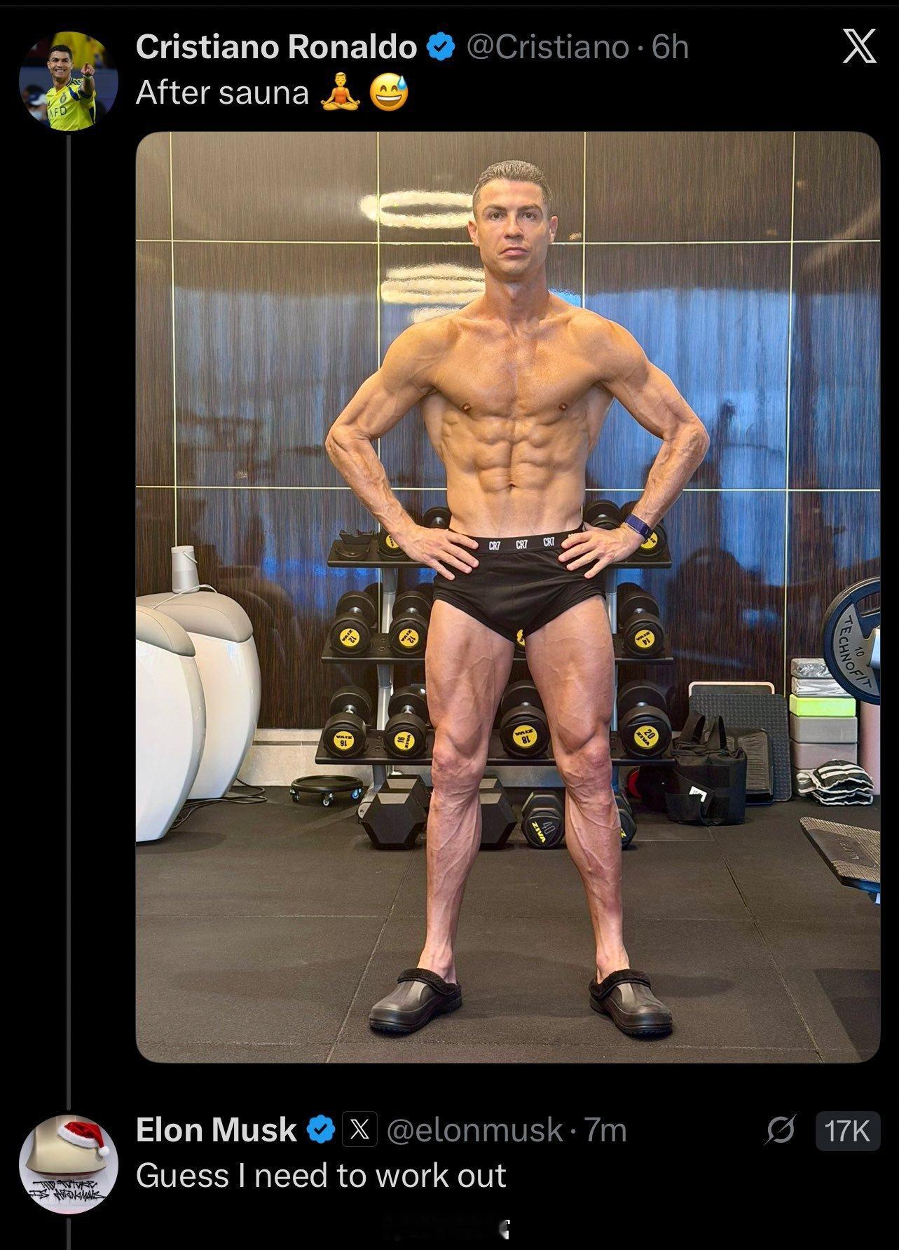 C罗发布蒸桑拿后的自拍照片连马斯克都有被40岁老将震撼到:我也需要锻炼了!从30到40,体脂率一直保持在7%这是极度自律的榜样马斯克被C罗身材卷到