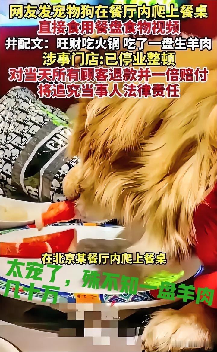 12月18日事发北京,小仙女不但没制止自己的宠物狗上火锅店桌子舔吃羊肉卷,而且洋洋得意,竟然还拍摄狗狗甜食照片发到网上等人夸,一边录制一边笑称:“我该怎么夸它呢?太牛了吧,哈哈哈”。 事后北京一火锅店因相关视频停业,涉事顾客小仙女面临追责。这事的影响面可能会很大,毕竟发生在北京这样的大都市,涉及的公共卫生问题(狗舔公共餐具)会引更多关注。 关于宠物狗,这次不知北京律师又该怎么判呢?