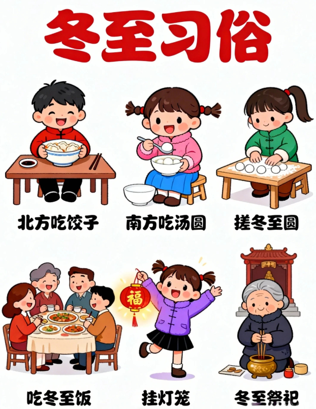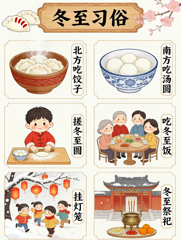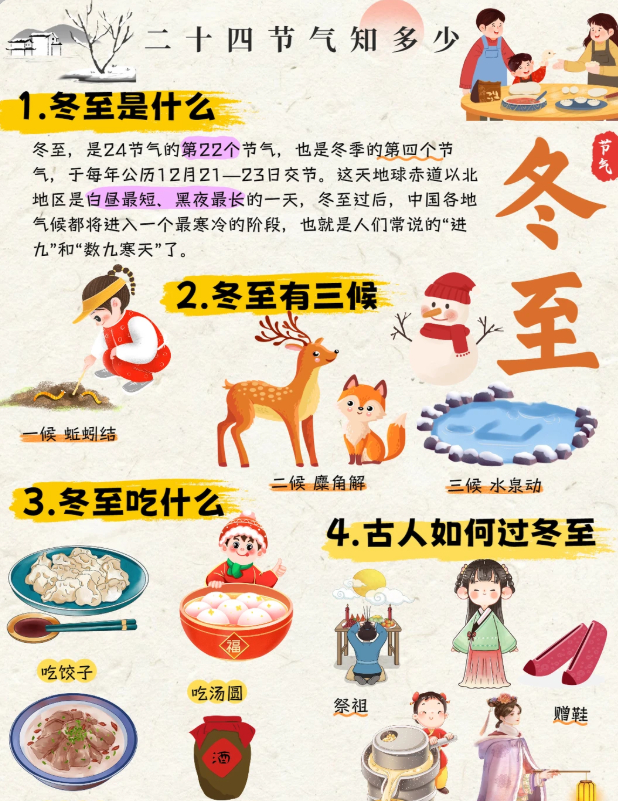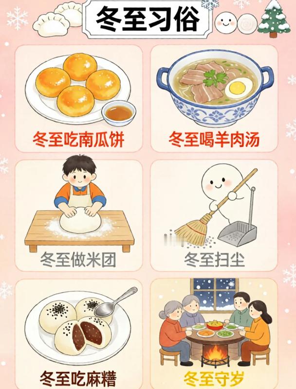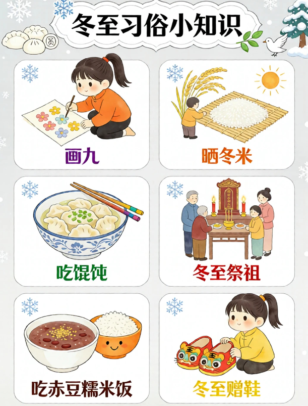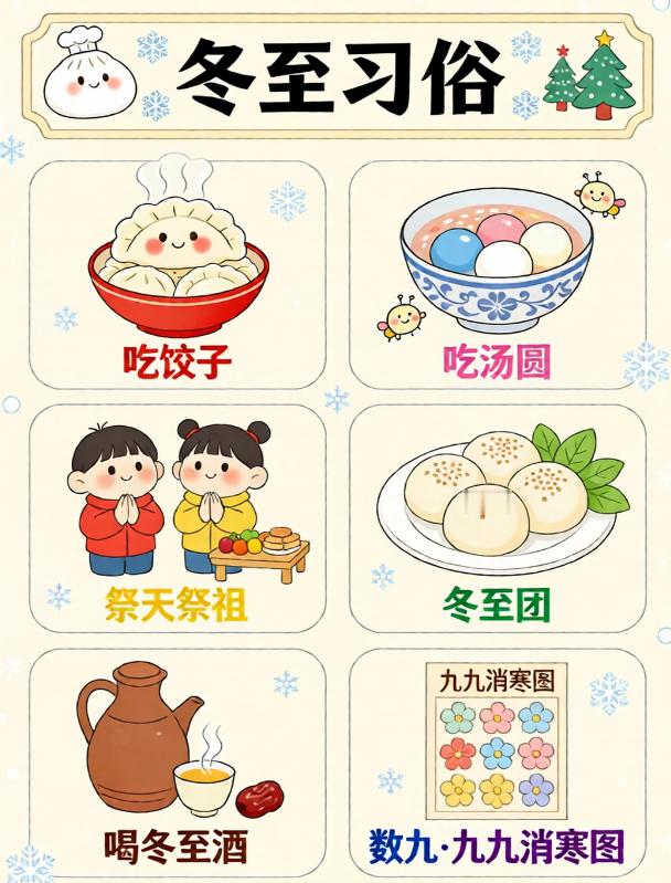 “冬至习俗文案 | 冬至是什么?”冬至,在古时,是一个非常重要的传统节日。01食饺子🥟老话常说 “冬至吃饺不冻耳”北方人的冬至标配当属热腾腾的饺子!02品汤圆🍡南方人冬至甜意,全藏在圆滚滚的汤圆里!软糯外皮裹着香甜内馅,沸水翻滚间满是团圆寓意.03始数九⛄️冬至一到,便开启 “数九寒天” 的时光!跟着 “一九二九不出手” 的谚语。04晒冬米🌾不少地方有冬至晒冬米的习俗晾晒储存粮食,寄托来年丰收的期许,盼着岁岁粮仓充盈,生活蒸蒸日上~05暖羊汤🍲寒冬进补正当时,一碗醇厚羊肉汤必不可少!06赠鞋🦂在冬至节里,民间有赠送孩童鞋帽的习惯。主要是希望孩子们能够健康地成长。07做豆腐♥俗话说:“要想富,冬至隔夜吃块热豆腐”在江浙一带的很多地方,到了冬至前后,会做一次豆腐🌟冬至别称:冬节、长至节、短至节、贺冬节、一阳节,亚岁、肥冬、喜冬等。冬至是四时八节之一,被视为冬季的大节日,在古代民间有“冬至大如年”的讲法。