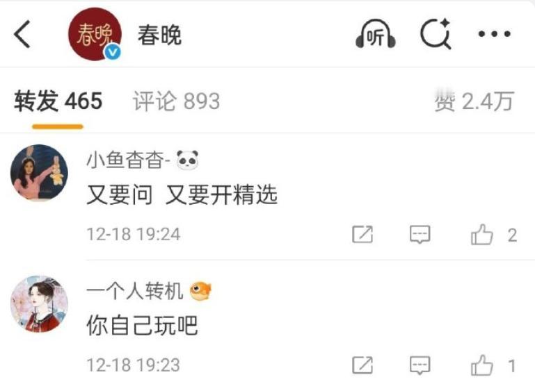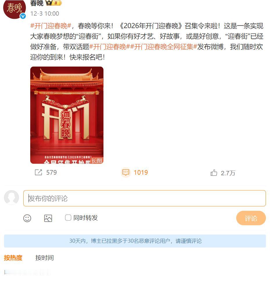 2026年春晚向社会征求意见了,这可真是破天荒头一回,毕竟这春晚早已成为圈内活动。 每年都是雷打不动的包饺子,相声小品都要有教育意义,催婚、催生,各种跨界,甚至一些节目都已经有了极端女权的影子。 那么这次是真心的吗? 春晚征求意见的原帖发布时间是12月3日。 本以为评论区会很精彩,结果一看,全是精选,怎么给人一种我就说说别太当真的感觉。这就是春晚的诚意,怕不是今年又要包饺子了。 说真的,作为一个南方人,是真的很烦大年三十包饺子,因为除夕晚上真不包饺子。作为一个全国性的晚会,怎么就不能照顾下南方人的感受,这都包了多少年。 既然春晚的诚意不足,那就看看网友们的奇思妙想。有网友直接提出了"春晚问政"的意见,实时投票问题城市直播问责,这判刑环节可比小品刺激。 无论是小品还是相声现在可都失去讽刺的外衣,全是各种催婚催育、强行煽情或价值观灌输。 顺带也要对导演、编剧、明星分会场同步查税、毒检,保证收视率破百。 当然除了这些有点过分的意见外,也有点正常的。如让喜剧人自由创作,保留原汁原味的幽默而非审查删改。 我一年365天被教育的够了,大过年的,还要被教育,谁受得了。 禁止跨界,让演员演戏、歌手唱歌,真没必要让影视演员尬演小品、歌手假唱。 还可以设立非遗民俗专场如汉服形制展示、方言节目、各省文化特色单元。新疆歌舞、南方戏曲可以单独展示而不是拼接。 别动不动就包饺子,地大物博的中国,难道只有饺子这一个食物代表过年吗? 春晚真该向河南卫视学一学,开启国风模式,用科技赋能传统文化,宣传一下中华民族的优秀文化,展示各民族文化底蕴,尤其是作为主体的汉族。 最后想说的是,既然选择公开征集意见了,就不要开什么精选,这做法真的很下头。