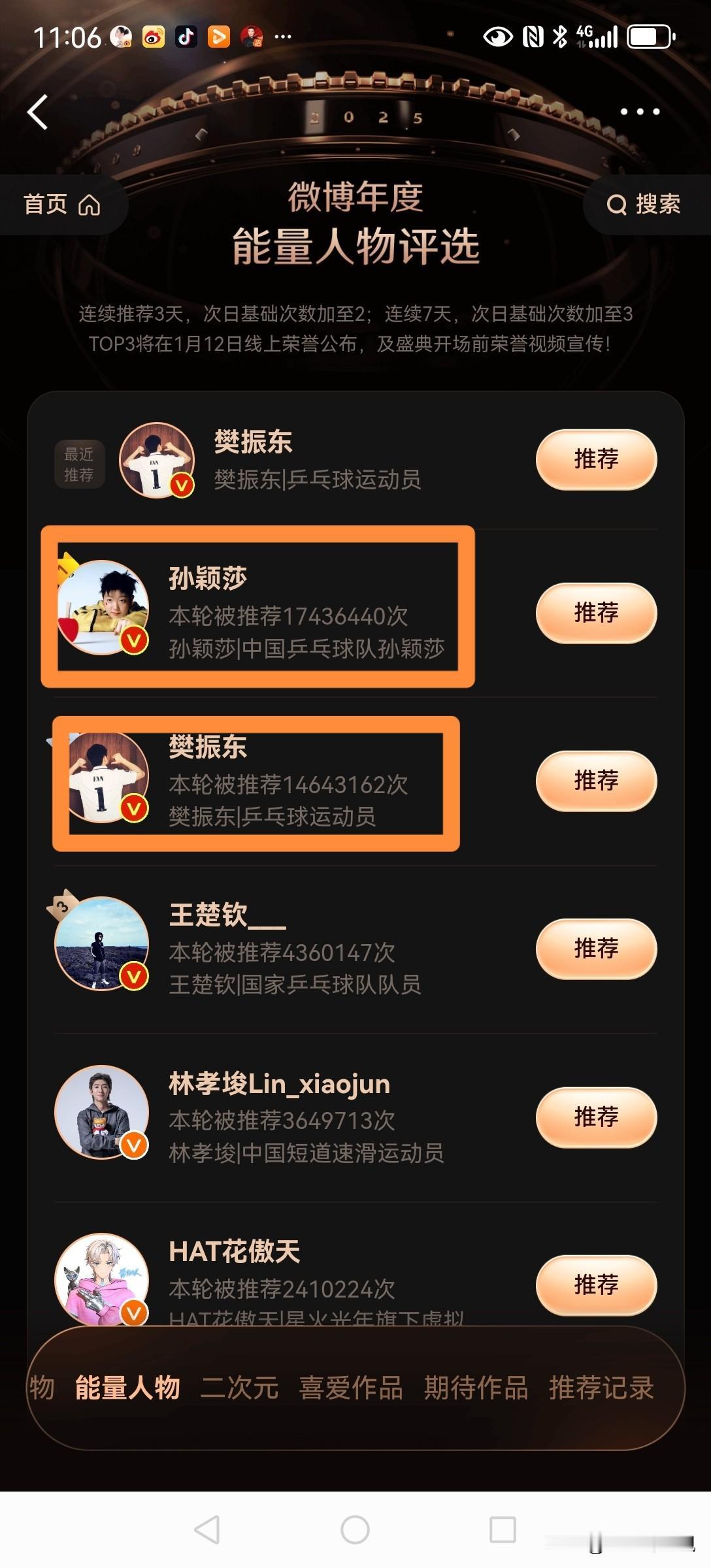 高,实在是高! 微博之夜能量人物投票进行中: 莎莎以17000000+位居榜首, 小胖则以14000000+位居次席。 不得不说,两人人气是真的高啊。 本来两人都是国乒颜值和实力的担当,这人气实至名归。可偏偏有人就是要挑事,说莎莎人气名符其实,倒是小胖的有资本运作或其他成分。 奉劝这些人醒醒吧,以前小胖的人气就不低,只是小胖的粉丝低调,不喜欢这些虚头八脑的东西而已。 自从去年巴奥和小胖退排后,小胖的粉丝觉得不能再这么低调了,爱小胖就要大声说出来,爱就要大胆表达出来,不能让自己的偶像再受委屈了。 所以,今年的微博之夜能量人物票选,小胖粉丝大部分参与进来了,目前只是正常值,还没到井喷,但已经能说明一切了。 莎莎和小胖,实至名归!