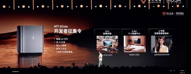除了MTTAIBOOK,摩尔线程还推出了一个名叫MTTAICUBE的硬件产品,同样搭载了大量的AI功能,张建中希望它可以承担起未来家庭的AINAS的功能。