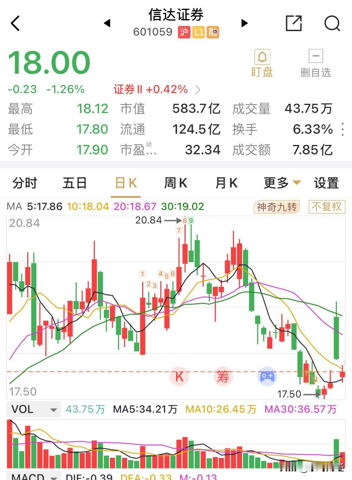 信达证券复牌后的走势复了寂寞。11月19日收盘价17.79元,复牌周五12月19日收18.0元,跌1.26%。 盘中最低17.8元,恰好仅比1月前高一分钱。 信达证券按0.5188换股中金公司,中金公司的收盘价35.92元,约价值18.63元,折价仅3%左右。 未来信达证券的走势或极度依赖中金公司。 但中金公司的各项指标在大中型券商中排名并不突出。 20左右的动态市盈率,30倍静态市盈率,市净1.78倍也明显高于龙于中信证券1.52倍,更别提仅13.77倍估值的中信证券。 而且券商板块2025年整体走弱,明显弱于指数,所以资金热情不足,也是理所当然! 原本指望中金公司吸并能推动劵商的热情,没想到反而是在伤口又撒了一把盐。 乐呀财经