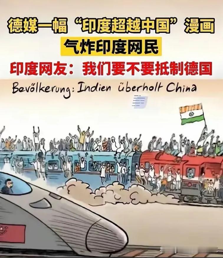 印度整天吹嘘自己超过了中国,中国虽然不屑回应,但这并不代表大家眼睛都是瞎的。德国媒体发布了一幅漫画,中国网友看了笑而不语,印度网友却气得破口大骂。 德国媒体把中国和印度的火车画到一起,画面能直观地看到中国的高铁外观现代、整洁,看着很新,而印度的列车则非常拥挤、车身老旧,车顶和侧面都是人。 画面上印度的火车还领先中国一头,旁边配了句“印度超过中国”的话,很多印度网友看到之后情绪很激动,认为德国人根本不了解印度的发展现状,说这是在拿印度差距最大的地方来对比中国,认为不公平。 有人说就算印度在某些方面确实有短板,也不能只看火车的拥挤程度,这根本代表不了全部,印度网民在社交网络上表达不满,有声音觉得这样的漫画没有看到印度正在进步的地方。 中国网友倒是不着急,有些人还拿来调侃,中国的媒体也没有特别解读这幅画,只是简单转发一下,和以前一有争议就争个你高我低相比,现在的网友更平静了,大家都清楚对外界的评论已经没必要太认真计较。 目前印度这几年不断喊着要追上乃至超过中国,无论是政策发布还是媒体宣传,“成为下一个大国”几乎成了口头禅,外界炒得沸沸扬扬,印度官员也在各种场合反复表示“印度已经走在前面”。 但面对这些声音,中国基本没有什么回应,中国很少参与这种争论,也不会拿数据或者名词去和别人对照,中国关注点早就放在了怎么把自己的日子过得越来越好。 德国作为局外人用这样一幅画来表达态度,用火车相比,一个靠速度和舒适度出名,一个至今还拥挤不堪,这种对比下表面上看印度“领先”,但细看细节实际情况一目了然,德国人明显在通过画面提醒,真正的赶超不是靠宣传,是看谁发展得实在。 最有打动力的话不是自己反复强调,而是局外人一句点破,有时候主角越低调,旁观者越会站出来用事实评价,成绩好不好实力够不够,时间和事实最有说服力,等一个国家真正做到了,谁也不用天天解释,强到自然有旁人为你说话。 大伙觉得一个国家到底该怎么看实力呢?欢迎留言一起聊聊。