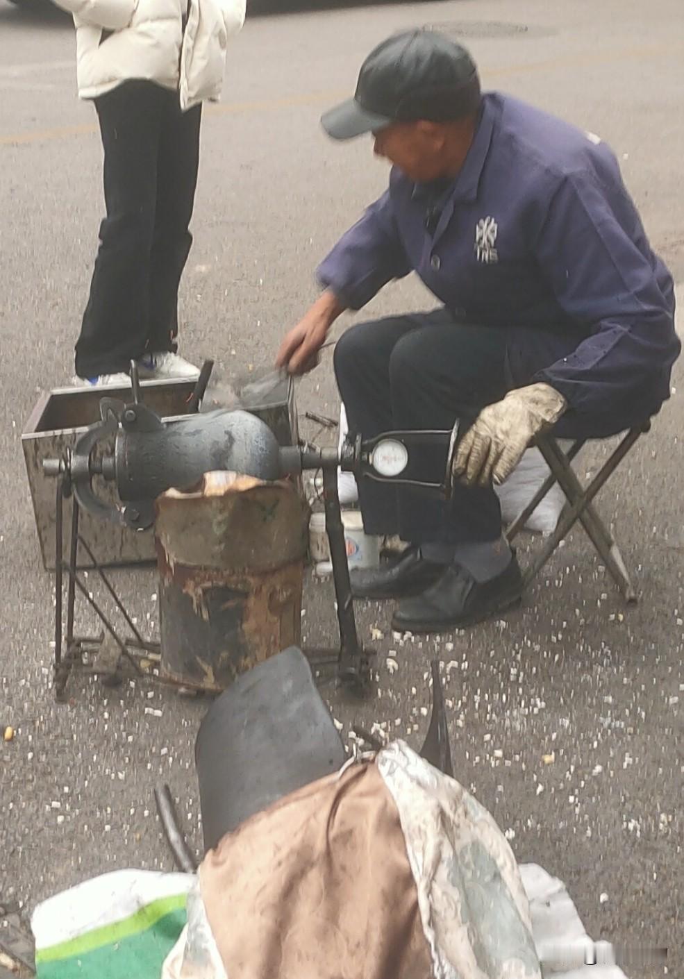 爆米得钱何所营? 《冬至日观辛苦爆米花匠有感》 爆米炉中滚旧声,风箱轻曳碳微明。 一枚铁釜藏秋实,数响砰然露碎琼。 不为朱门添绮馔,只谋寒腹暖浮生。 街头坐看人间味,粒粒皆含市井情。