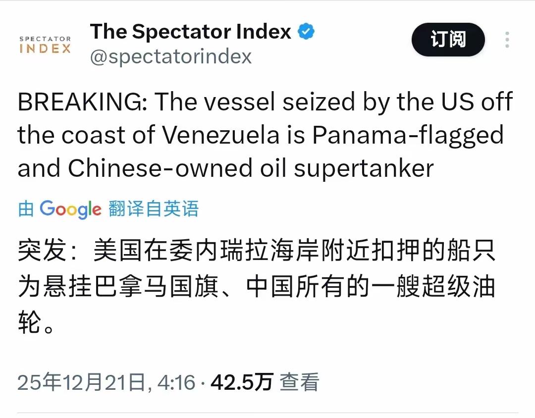 突发新闻:美国在委内瑞拉海岸附近扣押的船只为悬挂巴拿马国旗,中国所有的一艘超级油轮。另据其他外媒报道,美国发布了扣押中企拥有的“世纪号”油轮的视频,船上载有200万桶委内瑞拉原油,货物属于一家中国公司。 网友:美方公海扣押中国油轮,是对国际规则的公然践踏。长臂管辖的霸凌行径破坏全球贸易秩序,暴露其“规则合则用不合则弃”的双标本质。国际海洋法不容霸权肆意曲解。 有样学样,美国能做的我们可以做,通告全世界,如有违反中国的安全法,严禁运输对危害我中国国防安全的船只进入台海域,对违反我中国安全法的船只予以扣留。