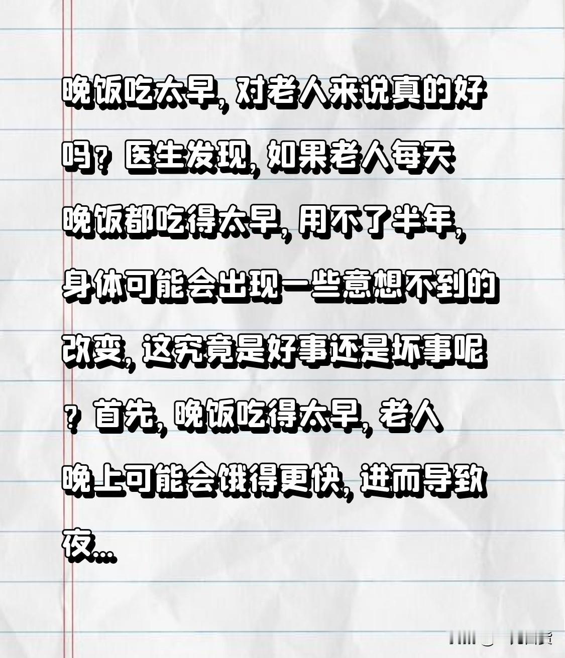 晚饭吃太早,对老人来说真的好吗?医生发现,如果老人每天晚饭都吃得太早,用不了半年