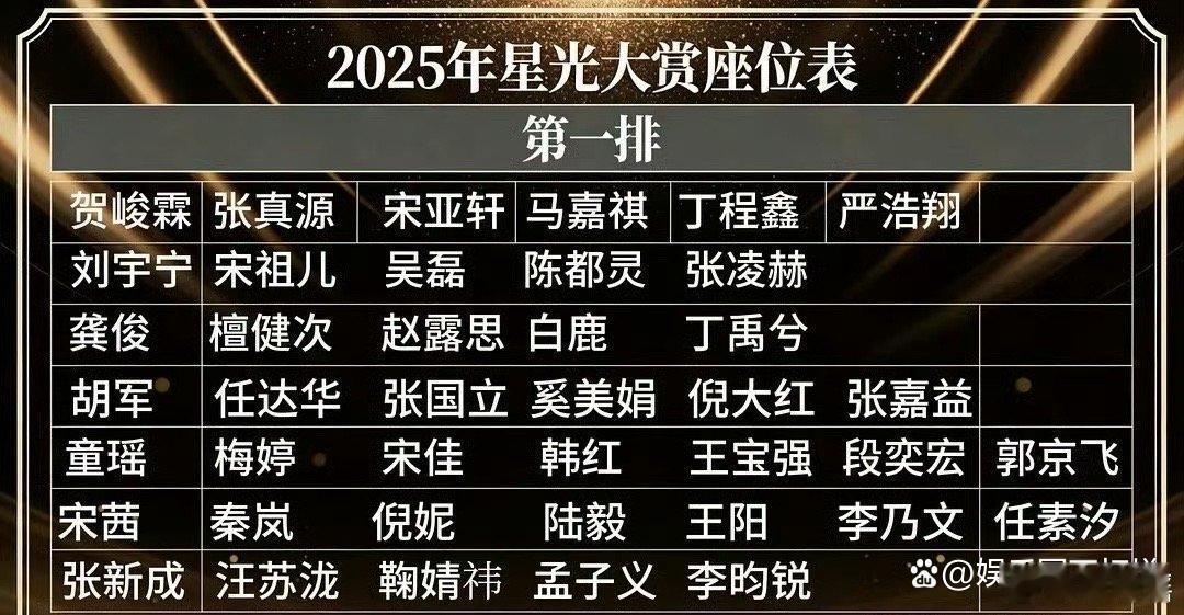2025年星光大赏座位表出炉 看看有没, 你喜欢的明星吧!座位区块分布与特点1。时代少年团全员占据首段马嘉祺,丁程鑫,宋亚轩,刘耀文,张真源,严浩翔,贺峻霖七人连坐,属于团体整体安排,位置显眼。2。新生代演员与流量艺人集中刘宇宁,宋祖儿,吴磊,陈都灵,张凌赫龚俊,檀健次,赵露思,白鹿,丁禹兮,这些座位以青年演员,热门剧集主演为主,反映其当前市场热度与话题性。3。实力派演员与资深艺人组,童瑶,梅婷,宋佳,韩红,王宝强,段奕宏,郭京飞胡军,任达华,张国立,奚美娟,倪大红,张嘉益此区域多为影帝影后,老戏骨或资深歌手,体现行业地位与口碑。4。中生代与实力演员混合区。宋茜,秦岚,倪妮,陆毅,王阳,李乃文,任素汐 涵盖电视,电影,综艺多领域活跃的演员,兼具人气与演技认可。5。年轻演员与歌手结尾段,张新成,汪苏泷,鞠婧祎,孟子义,李昀锐。以90后,00后艺人为主。