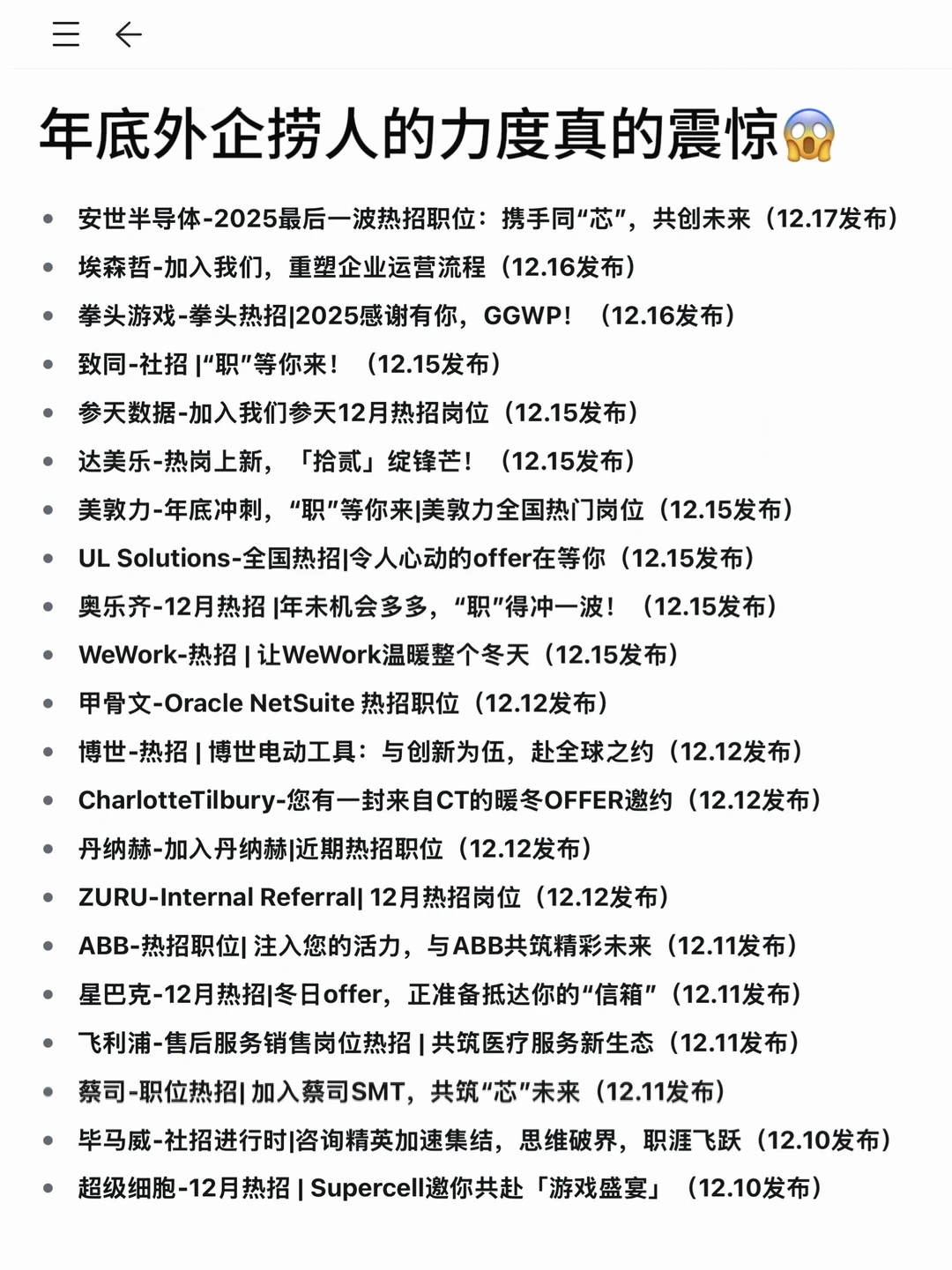 年底本来就是招聘淡季,但这段时间却明显感觉到:不少外企在悄悄开新岗位、补团队。 有的是新业务落地,有的是来年规划提前启动,也有的是预算释放后的集中招人,节奏比想象中积极。 · 为什么年底反而值得关注外企机会? ▪️年底流程相对精简、竞争压力小;岗位全面,背景和要求也很低 ▪️外企福利好,955双休、年假10-20天起步、对女性友好、还有健身、心理支持... ▪️年底跳槽的、空窗期长、找工作的人真的可以试试 · 坚持日更✊🏻,帮大家在找工作路上顺利拿 offer! ·