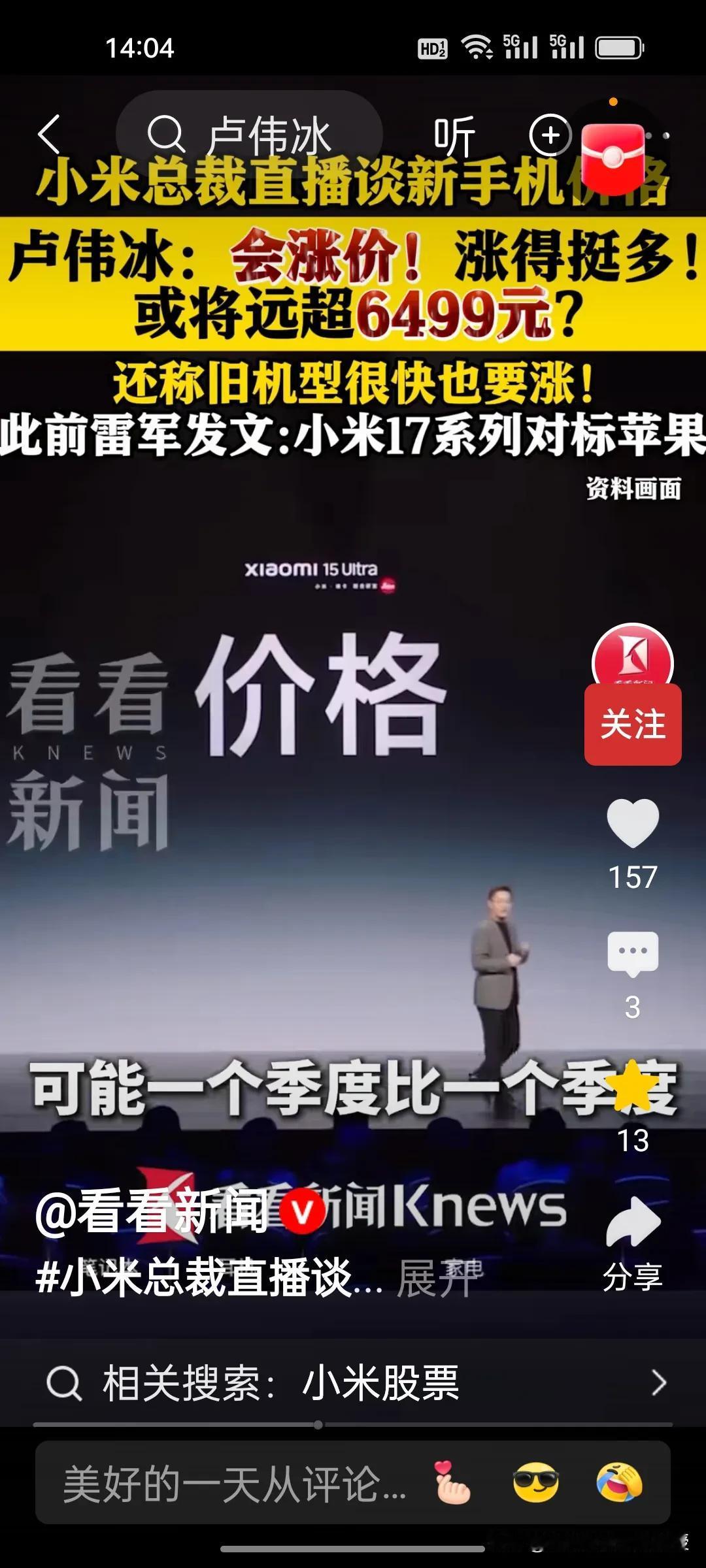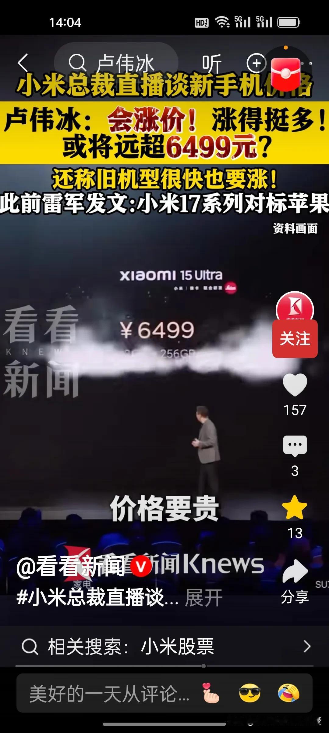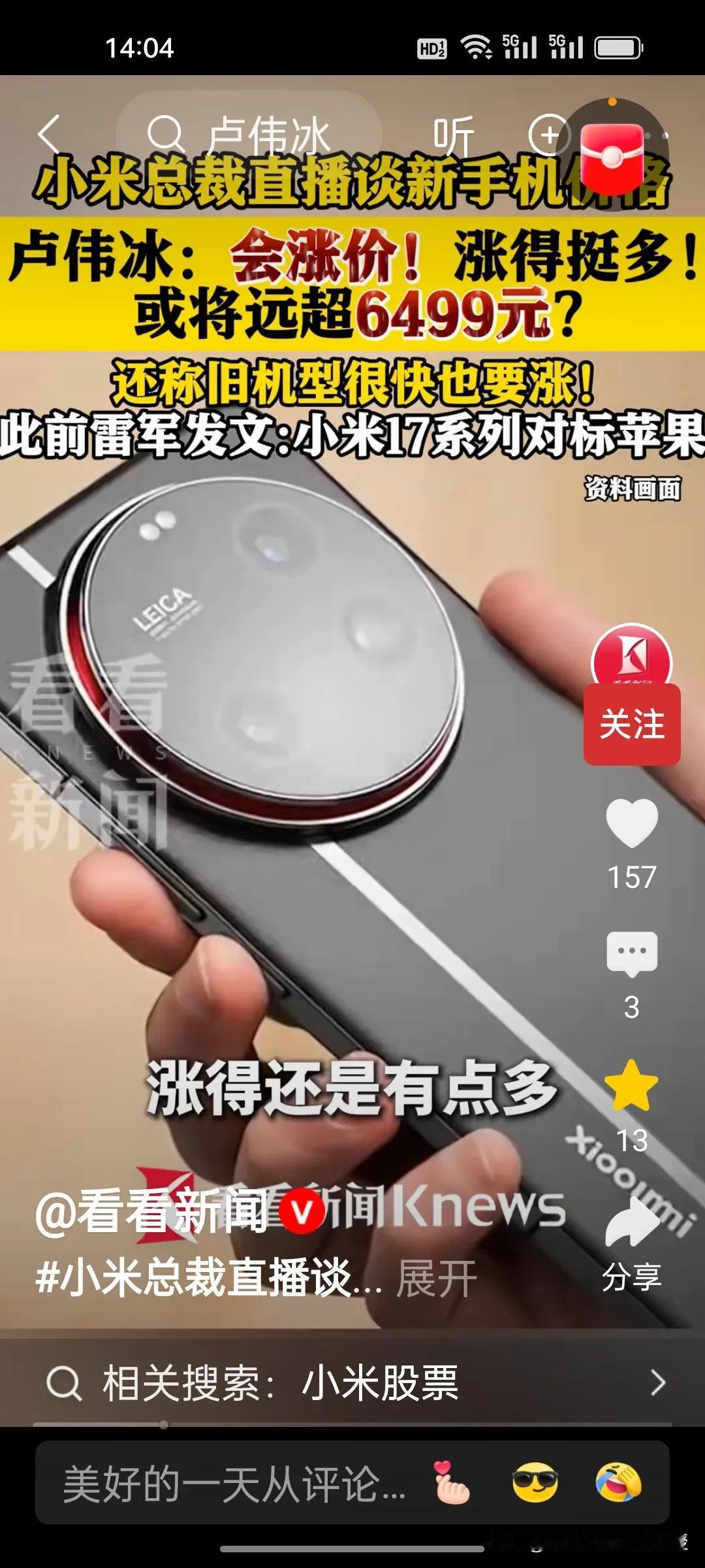 小米总裁提卢伟冰直言小米手机要涨价了:真不是想割韭菜,而是无可奈何。 小米17 Ultra要涨价,不是小米想赚更多,实在是成本越来越高,恐怕每个季度都会涨价,连旧款都会涨价。因为大厂全扎堆转产高利润AI内存,手机内存直接供给锐减,且价格暴涨,这波涨价周期要持续到2027年! 说到底,这波涨价是行业大趋势,所有手机品牌恐都要涨价,小米也躲不过!你愿意为小米新款手机多花几百块,还是选减配版低价机呢?