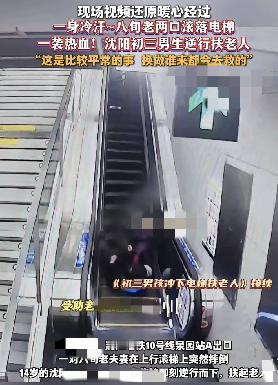 辽宁,一对老夫妻乘坐电梯时,不慎在电梯上摔倒。14岁少年看见后二话不说,三步并作两步跑上前扶起老人。事后,老人带着礼物和锦旗上少年学校方面感谢! 年过八旬的张奶奶和其丈夫乘坐地铁出来,在乘坐滚动电梯过出口时,不小心一脚踩空,连带其丈夫一同摔倒在地。 这一幕正好被一穿着校服的14岁高同学看见,高同学在张奶奶的前面一段距离,高同学也没想着自己会不会被讹上,掉头三步并作两步的下来扶起张奶奶,并说道:“奶奶奶奶,快起来,太危险了!” 奶奶起来后,看见了高同学校服上写着的学校的名称,并问高同学叫什么名字,高同学说这小事,谁看见了都会帮忙。 高同学不说自己叫什么名字,张奶奶就不让他走,没有办法只好报上了自己的名。 张奶奶这次摔得不轻,肋骨骨折,可她太想赶紧去感谢这个孩子了,于是,伤还没好,张奶奶便忍着疼痛带着礼物和锦旗,去高同学的学校当面答谢。
