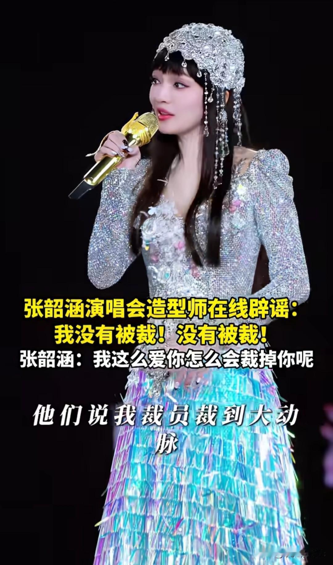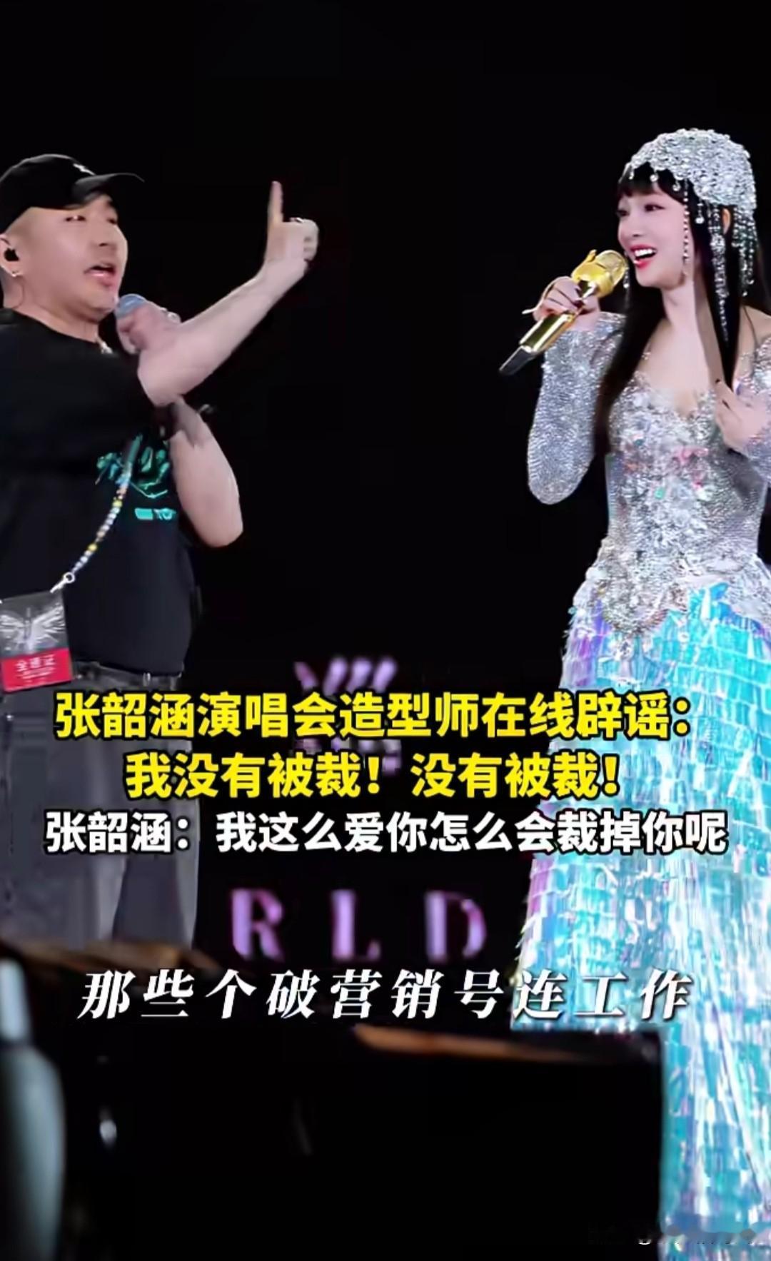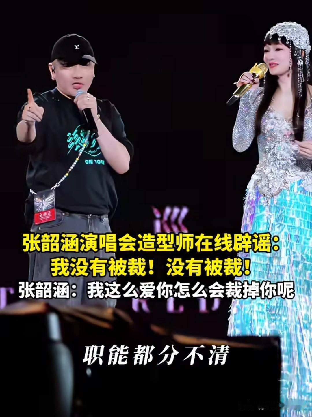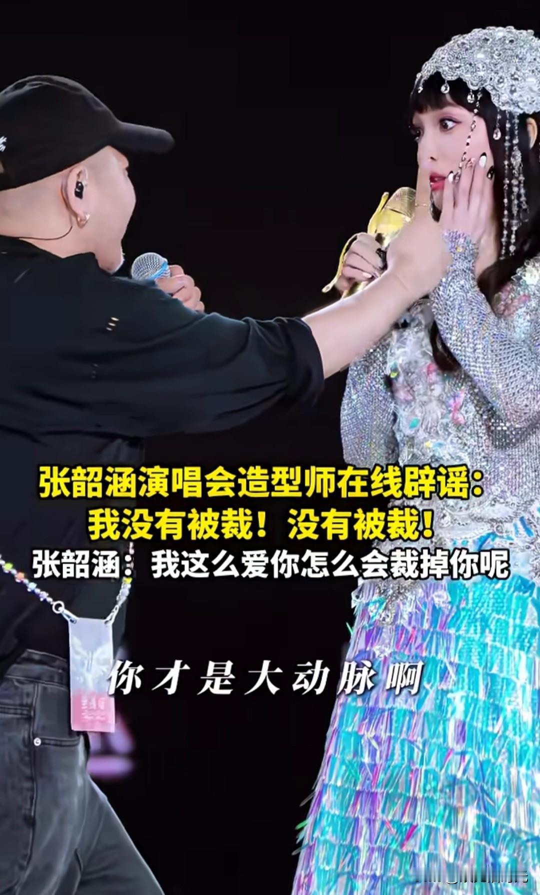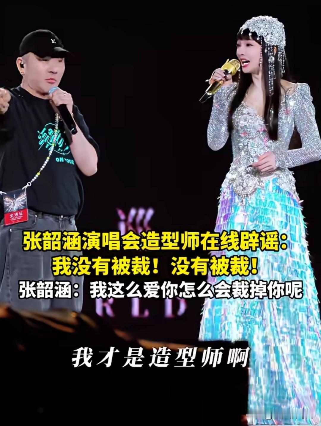 张韶涵造型师在线吐槽:那些个营销号乱写,连职能都分不清,我才是造型师啊,我还在呢。 演唱会上,他和张韶涵一唱一和。 张韶涵说:姜成皓你不是被我开除了?他们说我裁员裁到大动脉。 姜成皓举起一根手指轻轻晃动:我还在,而且,你才是大动脉。 造型师没换,换的是发型师。 这个辟谣也挺及时,上次换造型师的瓜还没消化完呢,结果就被迫终止了。 网友留言:要不趁着这个机会,劝劝关晓彤把造型师换了吧。 但我记得关晓彤曾说,她不会换,她可喜欢她的造型师了。
